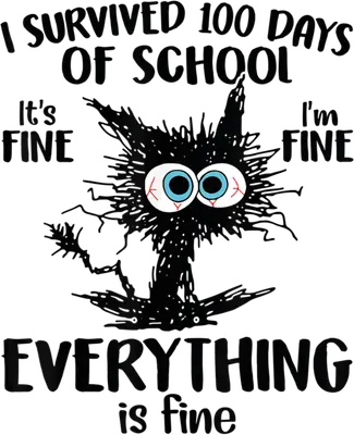 This design features a comically stressed, disheveled black cat-like creature with prominent bloodshot eyes, capturing the relatable feeling of exhaustion. The text reads "I SURVIVED 100 DAYS OF SCHOOL" at the top, flanked by "It's FINE" and "I'm FINE", and "EVERYTHING is fine" at the bottom. It's a perfect blend of humor and sarcasm, making it an excellent DTF transfer for anyone who can appreciate the irony of "surviving" a major milestone. This hilarious graphic is ready to press and adds a lighthearted touch to any garment. This design is perfect for students, teachers, and parents celebrating 100 days of school. It makes a fantastic iron on transfer for school spirit events or as a funny gift for educators. Small t-shirt businesses and crafters seeking unique educational humor designs will find this heat transfer design a popular choice. It's also ideal for creating matching shirts for school staff or student groups. Applying this vibrant heat press transfer is quick and easy on cotton, polyester, blends, and nylon. Use a heat press (300-325°F, 15 seconds, medium pressure) or a household iron. No weeding required—just peel and press! Perfect for custom t-shirts, hoodies, sweatshirts, tote bags, and aprons. For durability, wash inside out and tumble dry low. This ready to press transfer ensures exceptional quality with vibrant, full-color printing and crisp detail. The design is crack-resistant and soft to the touch, without the heavy feel of vinyl. Each direct to film transfer is printed on premium DTF film with a strong adhesive backing for professional results every time. Expect a durable, long-lasting design.