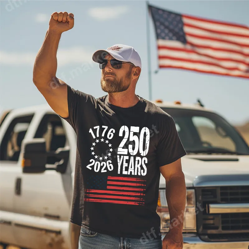 See allThis striking DTF transfer commemorates 250 years of American independence, featuring the historic dates 1776 and 2026 boldly displayed alongside '250 YEARS.' The design incorporates a classic Betsy Ross flag circle with 13 stars, symbolizing the original colonies, and a distressed American flag motif, adding a vintage, patriotic feel. This powerful heat press design is ready to elevate any garment with a deep sense of national pride and historical significance. Ideal for patriots, veterans, history enthusiasts, and anyone proud of America's heritage, this apparel transfer makes a perfect statement piece for Independence Day, Memorial Day, Veterans Day, or the upcoming 250th anniversary in 2026. It's an excellent gift idea for family members, friends, or colleagues who cherish American values and history. Outfit your entire family for patriotic events, historical reenactments, or casual wear to showcase your pride. Applying this direct to film transfer is straightforward and hassle-free, suitable for a wide range of fabrics including cotton, polyester, and various blends. Achieve professional results using a heat press set at 300-325°F for 15 seconds with medium pressure. For smaller projects or home use, a household iron can also be used, following specific instructions. The beauty of this iron on transfer is that it requires no weeding, saving you valuable time and effort in your crafting process. Our premium quality DTF transfers boast vibrant colors and sharp details that truly stand out. Engineered for durability, they are crack-resistant, peel-resistant, and maintain their vividness even after numerous washes. The soft-touch finish ensures comfort when worn, feeling like part of the fabric itself. Each custom transfer is printed on professional DTF film with a strong, reliable adhesive, ensuring a long-lasting and high-quality finish on your chosen garment.