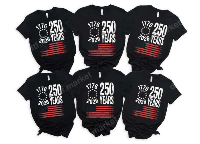 See allThis commemorative DTF transfer celebrates 250 years of American independence, spanning from 1776 to 2026. Featuring bold "1776 250 2026 YEARS" text, a classic Betsy Ross flag circle, and a distressed American flag, this design exudes a strong patriotic and historical vibe. It's a striking heat press transfer that arrives ready to press for custom apparel. This design is ideal for history enthusiasts, proud Americans, and anyone looking to commemorate this significant milestone. It's perfect for Fourth of July celebrations, Memorial Day, Veterans Day, historical events, or simply everyday wear to showcase patriotism. This eye-catching iron on transfer makes an excellent gift for family and friends who cherish American heritage. Applying your new t-shirt transfer is straightforward. Our high-quality direct to film transfers adhere beautifully to a wide range of fabrics, including cotton, polyester, and blends. For best results, apply with a heat press at 300-325°F for 15 seconds with medium pressure. It can also be applied with a household iron with firm, even pressure. Enjoy no weeding or layering! You'll love the professional finish and durability of this apparel transfer. Our DTF transfers are known for their vibrant colors, exceptional detail, and crack-resistant flexibility, ensuring your design looks great wash after wash. The soft-touch feel integrates seamlessly with the fabric, and the strong adhesive on our professional DTF film guarantees a long-lasting bond.