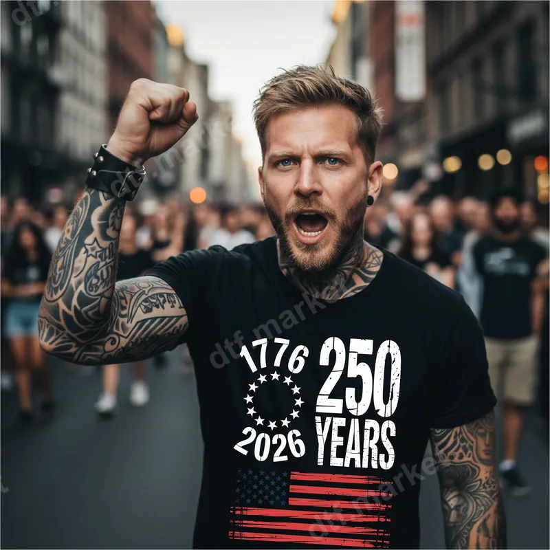 See allThis bold DTF transfer celebrates 250 years of American independence, featuring "1776" and "2026" alongside "250 YEARS" in a rugged, distressed font. It proudly displays the historic Betsy Ross circle of 13 stars and a grunge-style American flag, making it a powerful patriotic statement. This ready to press design instantly transforms any garment. Perfect for patriots, history enthusiasts, and anyone celebrating American heritage. This versatile heat transfer is excellent for Fourth of July, Memorial Day, Veterans Day, or everyday wear. It makes a thoughtful gift for veterans, service members, or anyone cherishing American values as we approach the 250th anniversary. Applying this design is simple and efficient. This iron on transfer works flawlessly on cotton, polyester, and blends. For best results, use a heat press at 300-325°F for 15 seconds with medium pressure, then cool peel. It can also be applied with a household iron. No weeding or layering needed; just press and go! Crafted using professional-grade DTF film and vibrant, long-lasting inks, this t-shirt transfer ensures stunning visual impact. Our heat press ready transfers offer exceptional durability, resisting cracks and fading even after multiple washes. The result is a soft-to-the-touch finish that feels like part of the fabric, ensuring comfort and a professional look.