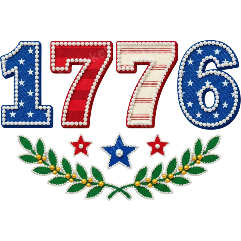 See allThis striking 1776 DTF transfer vividly captures the spirit of American independence with its intricate design. The numbers are adorned with rich textures resembling denim and striped fabrics, beautifully embellished with a border of lustrous pearls. Below, a majestic laurel wreath, also pearl-edged with golden berries, flanks elegant red and blue stars, creating a truly unique and ready to press artistic statement. Perfect for patriots, history enthusiasts, and anyone celebrating American heritage, this heat transfer design is ideal for the 4th of July, Memorial Day, Veterans Day, or any occasion to show national pride. It makes an exceptional gift for family and friends, or a standout item for small businesses looking to offer unique patriotic apparel. Applying this stunning design is simple and efficient. This versatile iron on transfer adheres flawlessly to a wide range of materials including cotton, polyester, and blends. Use a heat press at 300-325°F for 15 seconds with medium pressure, or apply with a household iron. Enjoy a professional finish without the hassle of weeding. Crafted from premium DTF film, this t-shirt transfer ensures vibrant colors that resist cracking and fading, maintaining a soft, comfortable feel on any garment. The strong adhesive provides lasting durability, making your custom apparel creations look professional and endure wash after wash.