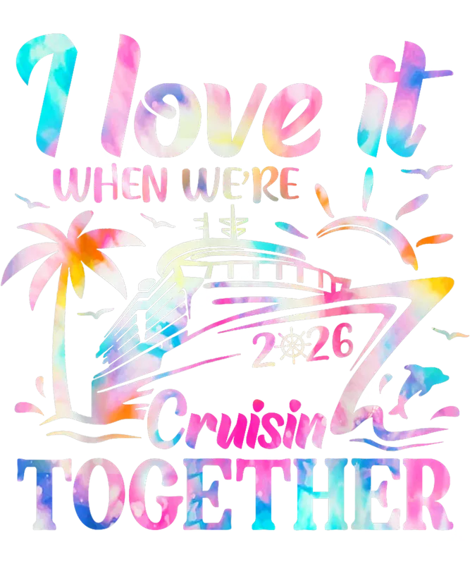 See allSet sail in style with this charming 'I Love It When We're Cruisin' Together 2026' DTF transfer. This vibrant design features a beautiful watercolor aesthetic with a palette of soft pastels and bright hues, depicting a majestic cruise ship, a tropical palm tree, a cheerful sun, and playful dolphins. The clear text, including the year '2026', makes it a perfect keepsake for future travel plans. This ready to press DTF transfer captures the joyous spirit of a vacation at sea, ideal for anyone looking to commemorate a special trip. This delightful heat transfer is designed for couples, families, and groups eagerly anticipating their 2026 cruise vacation. Whether you're celebrating an anniversary, a long-awaited trip with friends, or a family reunion at sea, this apparel transfer makes for a fantastic matching outfit element. It's also an excellent gift for travel enthusiasts, honeymooners, or anyone who dreams of ocean adventures and tropical destinations. Applying this high-quality iron on transfer is a breeze, perfect for customizing a wide range of garments and accessories. It works seamlessly on cotton, polyester, and cotton/poly blend fabrics. For best results, use a heat press at 300-325°F for 15 seconds with medium pressure, followed by a cool peel. While a heat press is recommended, a household iron can also be used with care. Enjoy professional-looking results without the hassle of weeding or layering vinyl transfer materials. Our direct to film transfer ensures a vibrant, durable, and crack-resistant finish that will last through many washes and wears. Made with professional-grade DTF film and strong adhesive, the colors pop beautifully and the design remains soft to the touch. Elevate your wardrobe with a unique heat press design that reflects your love for cruising and shared memories. Experience premium quality that brings your apparel to life.