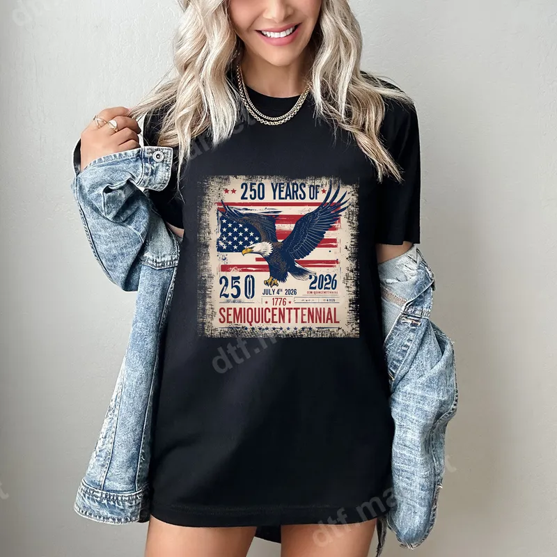 See allCommemorate a monumental milestone with our exclusive 2026 Semiquincentennial DTF transfer, celebrating 250 years of American independence. This striking design features a majestic bald eagle soaring over a vintage distressed American flag backdrop, emblazoned with '250 Years Of 2026' and '1776 SEMIQUICENTENNIAL'. It's a high-quality, ready to press direct to film transfer that brings patriotism to life with a timeless, rugged aesthetic, perfect for crafting unique apparel. This patriotic heat transfer is ideal for anyone looking to show their American pride for the 250th anniversary in 2026. Perfect for Fourth of July celebrations, Memorial Day, Veterans Day, or everyday wear. It makes an excellent gift for history buffs, veterans, active military, and proud Americans who want to commemorate this significant event. Create matching family shirts or unique gifts for patriotic events and gatherings. Our iron on transfers are incredibly versatile, pressing beautifully onto a wide range of fabric types, including cotton, polyester, and various blends. Applying your shirt design is simple with a heat press: 300-325°F for 15 seconds with medium pressure, then a cold peel. For those without a heat press, a household iron can also be used following specific instructions. Enjoy professional-quality results with no tedious weeding required, making custom apparel creation a breeze. Experience superior durability and vibrant color reproduction with our premium heat press ready designs. Each apparel transfer is crafted from professional-grade DTF film, ensuring a soft feel that integrates seamlessly with your garment. The transfers are crack-resistant, wash-durable, and boast strong adhesive properties for long-lasting wear. You’ll achieve bright, detailed graphics that maintain their integrity through countless washes, offering a retail-ready finish every time.