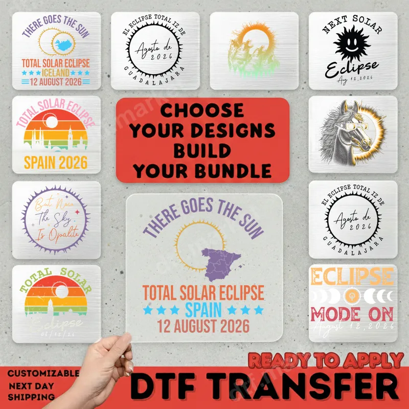 See allCelebrate the 2026 Total Solar Eclipse with our exclusive DTF transfer designs! Each ready to press transfer captures the excitement, featuring unique graphics for Spain, Iceland, and Guadalajara, with dates like August 12, 2026. From playful designs to scenic landscapes and retro lettering, these offer a diverse range to commemorate your eclipse experience or show your love for cosmic events. These direct to film transfers provide vibrant colors and sharp details for standout apparel. These eye-catching designs are perfect for eclipse chasers, travelers planning trips to Spain or Iceland in 2026, or anyone fascinated by astronomy. They make fantastic souvenirs for solar eclipse viewing parties, commemorative gifts, or unique apparel for science enthusiasts. Whether making custom t-shirts for your group or personalized gifts, these heat press designs are an ideal choice to mark this unforgettable event. Applying your DTF transfer is simple and hassle-free, suitable for cotton, polyester, and blends. For best results, use a heat press at 300-325°F for 15 seconds with medium pressure, then cold peel. A household iron can also be used. Unlike traditional vinyl transfers, these iron on transfers require no weeding, saving time and effort. Just press and peel for a professional-looking finish. Each of our ready to press transfers is crafted using high-quality DTF film and inks, ensuring exceptional durability and a vibrant, long-lasting finish. Advanced printing technology results in designs that are crack-resistant, fade-resistant, and incredibly soft to the touch, integrating with fabric. Our professional-grade apparel transfers offer strong adhesive properties, guaranteeing your design stays put through countless washes. Create custom garments with confidence.