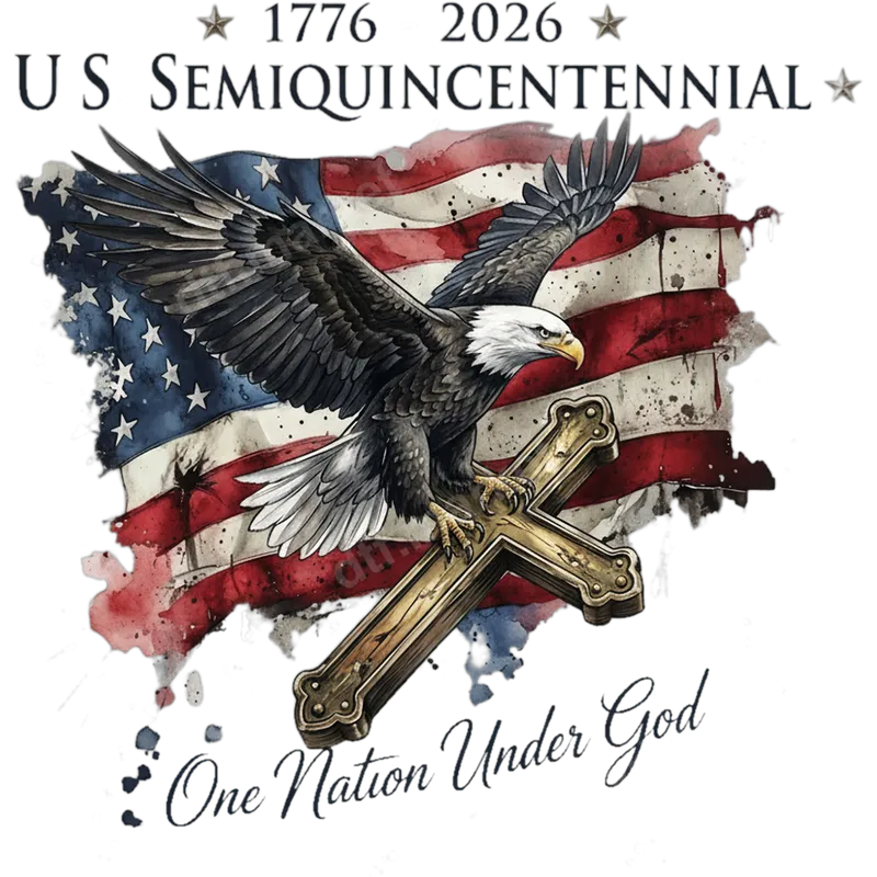 See allThis striking DTF transfer commemorates the upcoming US Semiquincentennial in 2026, celebrating 250 years of American history. It features a majestic bald eagle soaring above a rustic, watercolor-style American flag, with a detailed wooden cross. The text "1776 2026 US SEMIQUINCENTENNIAL" and "One Nation Under God" convey a strong message of patriotism and faith. This ready to press heat transfer captures a spirit of liberty and devotion, perfect for honoring America's legacy. Ideal for patriots, veterans, faith-based communities, and anyone proud of their American heritage, this design makes a powerful statement. It's perfect for patriotic holidays like the 4th of July, Memorial Day, and Veterans Day, or for events leading up to the 2026 Semiquincentennial. Create meaningful gifts for family and friends, or personalize your own apparel to showcase national pride and spiritual conviction. This unique iron on transfer expresses your beliefs. Applying this direct to film transfer is straightforward and hassle-free, working beautifully on cotton, polyester, and blends. For best results, use a heat press at 300-325°F for 15 seconds with medium pressure, then peel cold. You can also achieve excellent results with a household iron. Unlike traditional vinyl transfers, there's no weeding required, making customization quick and easy for any project. Experience exceptional quality with our professional-grade DTF transfers. Each design boasts vibrant, true-to-color inks that are crack-resistant and durable through countless washes. The transfers are soft to the touch, ensuring comfort on any garment. Printed on premium DTF film with a strong, reliable adhesive, these designs provide a long-lasting, professional finish that stands the test of time. Your shirt design will look fantastic and feel great.