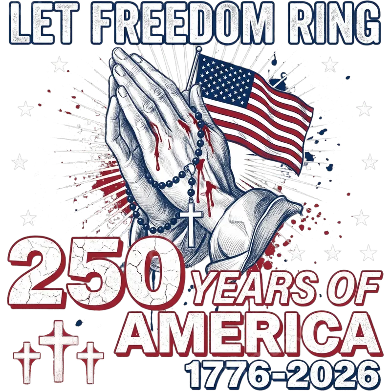 See allThis DTF transfer celebrates 250 years of American liberty with a powerful patriotic and faith-filled design. It features detailed praying hands holding a rosary with a cross, alongside a waving American flag. "LET FREEDOM RING" boldly crowns the design, while "250 YEARS OF AMERICA 1776-2026" marks a significant national milestone. Red and blue splatter effects enhance themes of sacrifice and resilience. This heat press ready design is perfect for those who cherish both faith and country. This graphic is ideal for proud Americans, veterans, active military, and anyone who deeply values faith and freedom. It's perfect for patriotic holidays like the 4th of July, Memorial Day, Veterans Day, or commemorating the 250th anniversary in 2026. This design makes a thoughtful gift for family or church groups wishing to express devotion to God and country. It's also great for political rallies, community events, or everyday wear to showcase American pride. Applying this high-quality iron on transfer is simple, requiring no weeding for custom apparel. Our direct to film transfer suits various fabrics: cotton, polyester, and blends. For best results, use a heat press at 300-325°F for 15 seconds with medium pressure, then peel cold. A household iron with firm pressure also works. Detailed instructions are included, ensuring a professional finish. Expect exceptional quality with this heat press design. Our premium DTF transfers boast vibrant colors and sharp details, engineered for durability. They are crack-resistant, peel-resistant, and withstand numerous washes without fading. The finished graphic feels soft, blending seamlessly with fabric for comfort. Crafted on professional-grade DTF film with strong adhesive, these apparel transfers ensure your custom creations look fantastic and last.