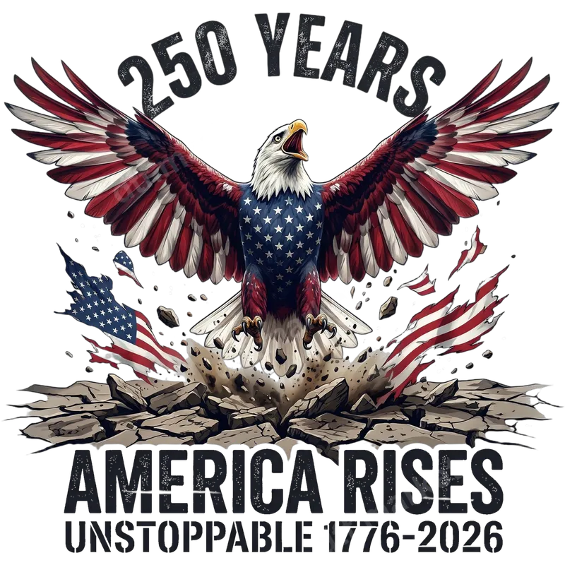 See allThe design features a majestic bald eagle with wings in the American flag's red, white, and blue, dramatically breaking through shattered ground. Above, "250 YEARS" announces a significant milestone, while below, "AMERICA RISES UNSTOPPABLE 1776-2026" boldly declares resilience and national pride, commemorating 250 years of American independence. This powerful patriotic DTF transfer is a ready to press design that captures the spirit of strength and enduring freedom, making a bold statement for any garment. This powerful heat transfer is ideal for anyone looking to showcase their American pride, from veterans and active military members to patriots and history enthusiasts. It's perfect for celebrating national holidays like the Fourth of July, Memorial Day, and Veterans Day, or for everyday wear to express your love for the USA. This unique design also makes an exceptional gift for family and friends who appreciate patriotic themes and American heritage. Applying this high-quality shirt design is straightforward and hassle-free. Our heat press ready transfers work seamlessly on a wide range of fabrics including cotton, polyester, and cotton-poly blends. For best results, use a heat press at 300-325°F for 15 seconds with medium pressure. It can also be applied with a household iron, following included instructions. Forget complex weeding processes; these iron on transfers are designed for quick and easy application, saving you time and effort. Experience superior quality with our direct to film transfers. Each design is printed with vibrant, long-lasting colors that resist cracking and fading, ensuring your apparel looks great wash after wash. The professional-grade DTF film provides a soft, flexible feel that seamlessly integrates with the fabric, unlike bulky vinyl transfers. Our strong adhesive ensures a durable bond, making this apparel transfer a resilient and eye-catching addition to any wardrobe.