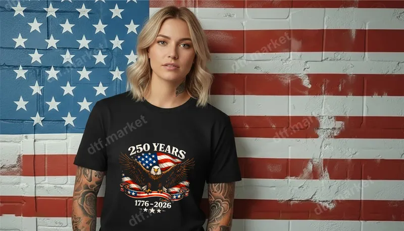 See allThis vibrant DTF transfer proudly commemorates 250 years of American independence, spanning 1776 to 2026. Featuring a majestic bald eagle with outstretched wings, set against a flowing American flag banner, and boldly proclaiming "250 YEARS" above "1776-2026," this design captures the spirit of freedom and patriotism. It’s a powerful ready to press transfer that brings a rich historical aesthetic to any garment or accessory. Perfect for proud Americans, history enthusiasts, veterans, and anyone celebrating national heritage. This heat transfer is ideal for creating custom apparel for Independence Day, Memorial Day, Veterans Day, Fourth of July barbecues, patriotic parades, or as a meaningful gift for those who cherish American history. Easily create custom t-shirts, hoodies, and more to express your national pride. Applying this direct to film transfer is straightforward with a heat press or even a household iron. For best results with a heat press, apply at 300-325°F for 15 seconds with medium pressure. This versatile iron on transfer works beautifully on cotton, polyester, and various fabric blends, providing a professional finish without the need for intricate weeding. Crafted with professional-grade DTF film, our transfers ensure exceptional durability and stunning visual appeal. Expect vibrant colors, sharp details, and a soft-to-touch feel that resists cracking and peeling, even after multiple washes. This high-quality t-shirt transfer ensures your custom creations look fantastic and last for years to come.