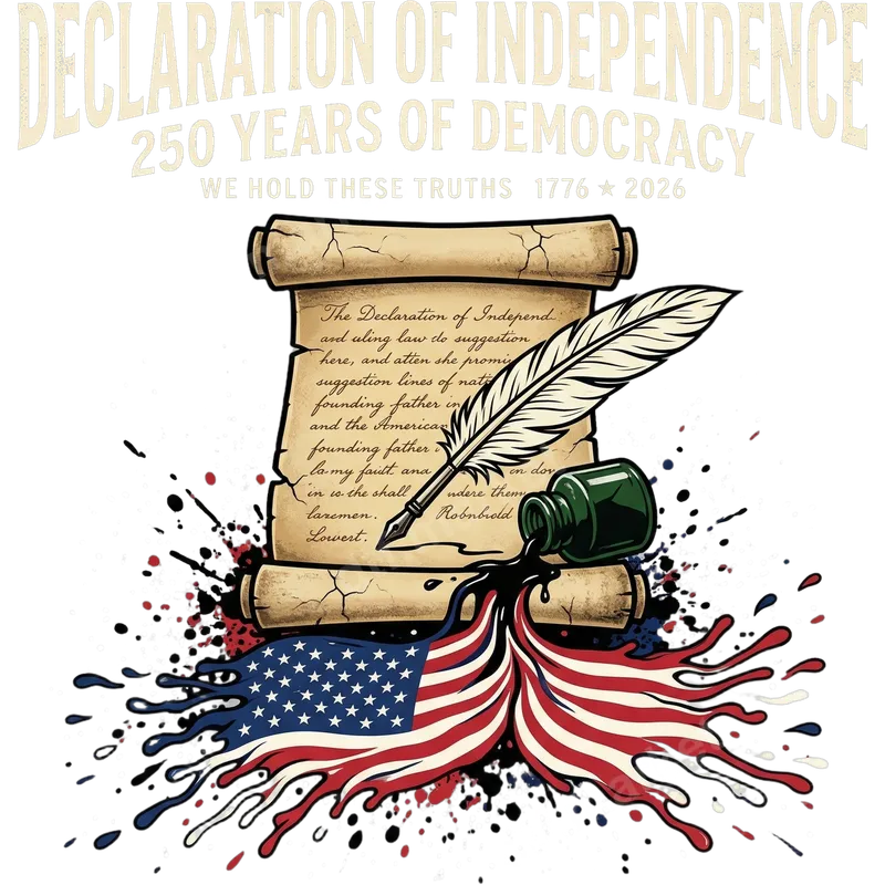 See allThis impactful DTF transfer commemorates "250 Years of Democracy" from 1776 to 2026, featuring the iconic "Declaration of Independence" scroll, a quill, and a flowing American flag design. The distressed patriotic imagery, complete with ink splatters, creates a powerful and artistic statement. This ready to press transfer is perfect for honoring American history and heritage. This design is ideal for patriots, history enthusiasts, and anyone celebrating American independence. It's a fantastic choice for Fourth of July festivities, historical commemorations, Memorial Day, Veterans Day, or everyday patriotic wear. This heat transfer makes a thoughtful gift for history teachers, veterans, or proud Americans looking to express their national pride on custom apparel. Applying this vibrant design is straightforward. Our high-quality heat press transfer adheres beautifully to a wide range of materials, including 100% cotton, polyester, and cotton/poly blends. For best results, use a heat press at 300-325°F for 15 seconds with medium pressure, then peel cold. A household iron can also be used following specific instructions. No tedious weeding or layering is required, making your apparel customization quick and easy. Crafted with professional-grade DTF film, this iron on transfer ensures stunning colors that pop and exceptional durability. The design is crack-resistant, wash-fast, and boasts a soft, lightweight feel once applied. Our advanced printing technology guarantees a crisp, long-lasting t-shirt transfer that stands up to wear and washing, providing a premium finish for all your garments.