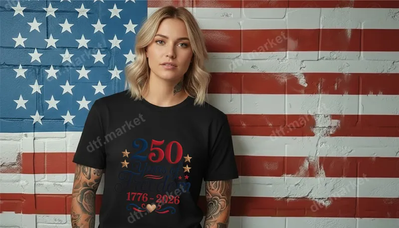 See allCommemorate a monumental milestone with our '250 Years of Freedom 1776-2026' DTF transfer. This patriotic design beautifully combines bold red and blue numerals with elegant script, adorned with golden stars and flourishes. It's a vibrant, ready to press heat transfer that captures the spirit of American independence and celebration, perfect for expressing national pride. The intricate detailing and classic colors make it a standout design for any garment. This special iron on transfer is ideal for patriots, history enthusiasts, and anyone looking to celebrate the United States' upcoming 250th anniversary in 2026. Perfect for 4th of July celebrations, Memorial Day, Veterans Day, or everyday wear to show your love for country. It makes a thoughtful gift for family, friends, and military personnel, allowing them to proudly display this significant historical marker on their apparel. Our premium DTF transfer is incredibly versatile, designed to apply seamlessly to a wide range of fabrics, including cotton, polyester, and various blends. For best results, use a heat press at 300-325°F for 15 seconds with medium pressure. It can also be applied with a household iron, following included instructions. This heat press design eliminates the need for weeding, making application quick and hassle-free for everyone. Experience superior quality with our durable and vibrant apparel transfer. Each image is printed using high-grade inks on professional DTF film, ensuring brilliant colors that won't crack, peel, or fade over time. The result is a soft-to-touch design that integrates smoothly with the fabric, providing a professional finish that looks fantastic on t-shirts, hoodies, tote bags, and more. This ensures your celebratory message lasts for years to come.
