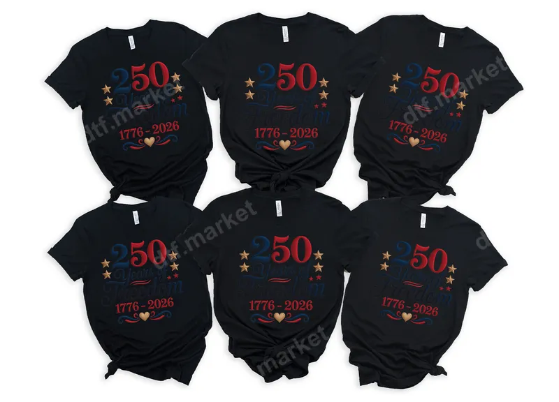 See allThis vibrant '250 Years of Freedom 1776-2026' DTF transfer celebrates a quarter-millennium of American independence. Featuring bold red and blue lettering accented with golden stars and elegant script, this ready to press transfer is perfect for commemorating the United States' significant anniversary. It evokes a proud, historical, and celebratory patriotic vibe, ideal for any enthusiast of American heritage. Designed for patriots, history buffs, and anyone celebrating American freedom, this heat press design is perfect for Independence Day, Memorial Day, historical commemorations, or everyday patriotic wear. It makes an excellent gift for veterans, service members, and families who cherish the nation's history. Create custom apparel for family reunions, community events, or historical society gatherings, making a statement of enduring liberty. Applying this high-quality iron on transfer is simple, making it accessible for both seasoned crafters and beginners. It adheres beautifully to a wide range of materials, including cotton, polyester, and their blends. For best results, use a heat press at 300-325°F for 15 seconds with medium pressure, then perform a cool peel. A household iron can also be used with care. No weeding is required, saving you time and effort. Experience vibrant, durable results with this professional-grade t-shirt transfer. Our DTF film ensures crack-resistant, fade-resistant designs that maintain a soft hand feel on any garment. The strong adhesive guarantees long-lasting wear, even after multiple washes. Produce professional-quality custom apparel that stands out and proudly displays your American spirit.