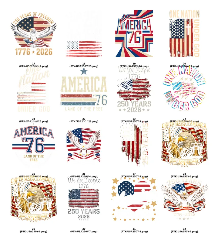 See allCelebrate a pivotal moment in American history with our "250 Years of Freedom" DTF transfer. This ready to press design features a majestic bald eagle with outstretched wings, soaring over a beautifully distressed American flag. Bold text proudly declares "250 YEARS OF FREEDOM" and the significant dates "1776 * 2026," evoking a strong sense of national pride and vintage Americana. This high-quality direct to film transfer is perfect for commemorating a quarter-millennium of liberty. This patriotic heat press transfer is ideal for anyone who cherishes American history and values freedom. It's a perfect choice for veterans, military families, history buffs, and proud citizens looking to display their patriotism. Use it to create unique apparel for the 4th of July, Memorial Day, Veterans Day, or any patriotic event. It also makes a thoughtful gift for those who appreciate meaningful, historical designs on their clothing. Our versatile iron on transfer is designed for easy application on a wide range of fabrics, including cotton, polyester, and various blends. Achieve professional results using a standard heat press at 300-325°F for 15 seconds with medium pressure, followed by a cold peel. For smaller projects or personal use, a household iron can also be used with careful application. Best of all, there's no weeding required, making your customization process quick and hassle-free. Experience the superior quality of our heat press ready designs. Each t-shirt transfer boasts vibrant colors, exceptional durability, and a soft, smooth finish that resists cracking and fading even after multiple washes. Crafted using professional-grade DTF film and strong adhesive, this apparel transfer ensures a long-lasting, high-definition image on your chosen garment, delivering a premium look and feel for all your custom creations.