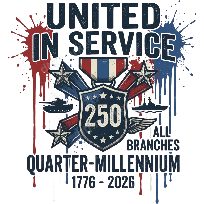 See allCommemorate a monumental milestone with our 'United In Service: Quarter-Millennium 1776-2026' DTF transfer. This striking design honors 250 years of unwavering dedication to the USA. It features a bold shield with '250 ALL BRANCHES,' flanked by stars, a military medal, and silhouettes of a tank, battleship, and wings, representing all armed forces. Distressed red, white, and blue paint splatters add a rugged, patriotic feel, creating a unique ready to press design. This powerful heat transfer is ideal for veterans, active service members, military families, and anyone proudly showing support for the US Armed Forces. It’s perfect for Memorial Day, 4th of July, Veterans Day, military appreciation events, or as a thoughtful gift. Customize t-shirts, hoodies, and more to proudly wear at parades, ceremonies, or as everyday patriotic apparel. Applying your new apparel transfer is effortless. Our high-quality transfers work beautifully on cotton, polyester, and blends. Use a heat press at 300-325°F for 15 seconds with medium pressure, cold peel, then press again for 5 seconds. This easy-to-use iron on decal requires no weeding, saving time and effort. A household iron can also be used with proper care. Experience professional-grade results with our premium DTF transfers. Each t-shirt transfer delivers vibrant colors, exceptional durability, and a soft, comfortable feel. Our advanced printing ensures crack-resistant designs that withstand repeated washing and wear. Crafted with strong adhesive and high-quality DTF film, these heat press designs offer superior adhesion and a smooth, lasting finish.