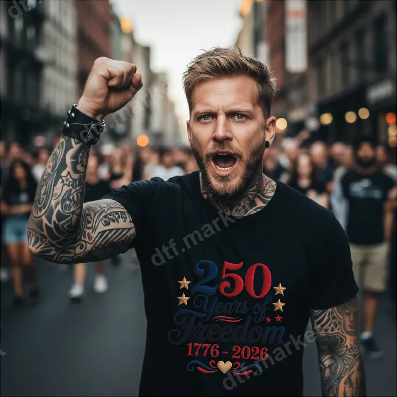 See allThis vibrant DTF transfer proudly commemorates "250 Years of Freedom 1776-2026" in a classic American patriotic style. Featuring bold red and blue typography accented with golden stars and a subtle heart motif, this design is a powerful statement of national pride. It's a high-quality, ready to press transfer perfect for celebrating American history and values. Ideal for patriots, history enthusiasts, and anyone looking to express their love for the USA, this heat transfer is perfect for upcoming national holidays, commemorative events leading up to 2026, or as a thoughtful gift. Customize apparel for family reunions, historical society gatherings, or simply wear your pride on a daily basis. Applying this durable heat press transfer is simple and efficient. It adheres beautifully to a wide range of materials including cotton, polyester, and their blends. For best results, use a heat press at 300-325°F for 15 seconds with medium pressure, then cold peel. A household iron can also be used with care. Enjoy the convenience of an iron on transfer with no weeding required. Crafted using professional-grade DTF film, this t-shirt transfer boasts exceptional vibrancy, ensuring your design truly stands out. It’s engineered to be crack-resistant, highly durable, and leaves a soft, comfortable feel on the garment. Experience premium quality with strong adhesive properties for a long-lasting, professional finish.