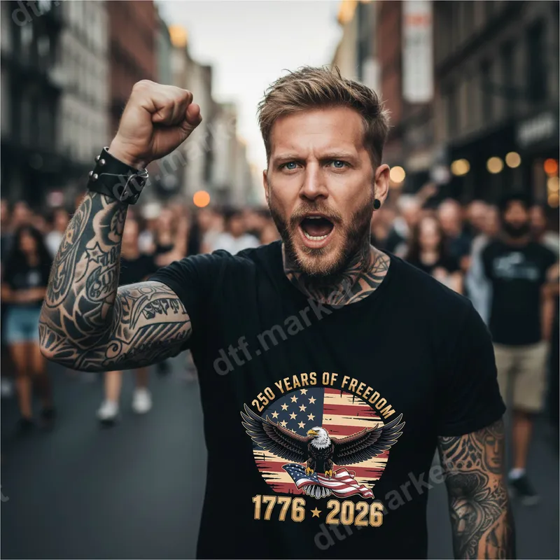 See allThis vibrant DTF transfer proudly commemorates "250 Years of Freedom" from 1776 to 2026, marking a significant milestone in American history. The design features a majestic bald eagle with outstretched wings, soaring above a distressed American flag backdrop. Beneath the eagle, another flag unfurls, enhancing the deep patriotic sentiment. This ready to press design captures the spirit of independence and national pride, making it an ideal statement piece for any garment. This powerful heat transfer is perfect for patriots, veterans, history enthusiasts, and anyone proud of American heritage. It’s ideal for Fourth of July, Memorial Day, Veterans Day, or historical anniversaries. Use it to create unique gifts or to show unwavering support for the USA. Imagine this bold graphic on custom apparel for rallies, parades, or everyday wear to express your love for liberty. Applying this professional DTF transfer is incredibly simple. It adheres beautifully to a wide range of fabrics, including cotton, polyester, and various blends, ensuring project versatility. For best results, use a heat press at 300-325°F for 15 seconds with medium pressure, then peel cold. A household iron can also be used. Unlike traditional vinyl transfer sheets, there’s no tedious weeding; just press and enjoy. Our direct to film transfers are known for exceptional quality and durability. You'll achieve vibrant, true-to-color results that stand out beautifully. The advanced ink ensures the design is highly crack-resistant and flexible, maintaining integrity even after numerous washes. Each apparel transfer is produced on premium DTF film with strong adhesive, delivering a soft-to-touch finish that feels integrated with the garment.