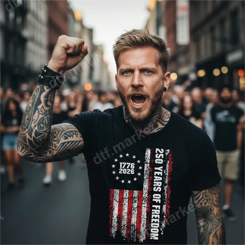 See allCommemorate a significant milestone with our '250 Years of Freedom' distressed American flag DTF transfer. This powerful design features a gritty, vertical flag motif with the dates '1776 2026' encircled by stars, alongside the bold text '250 YEARS OF FREEDOM.' It's a striking and meaningful design for anyone proud of American history and liberty, delivered as a premium, ready to press direct to film transfer for easy application. This patriotic heat transfer is ideal for history enthusiasts, veterans, active service members, and anyone celebrating American heritage. Perfect for 4th of July celebrations, Memorial Day events, Veterans Day tributes, political rallies, or as a thoughtful gift for patriots. Equip your family and friends with this impactful design to wear their American pride on various occasions. Applying this apparel transfer is incredibly straightforward. It works seamlessly on a wide range of fabrics, including cotton, polyester, and various blends. Simply use a heat press at 300-325°F for 15 seconds with medium pressure, or apply with a household iron. Unlike traditional vinyl transfer designs, there's no weeding required, saving you time and effort for a professional finish. Crafted from high-quality DTF film, our heat press designs boast vibrant colors, exceptional durability, and a soft-to-the-touch feel. This custom transfer is crack-resistant, ensuring your garment looks fantastic even after multiple washes. Enjoy a long-lasting, professional-grade finish that truly stands out, making it an excellent choice for custom apparel.