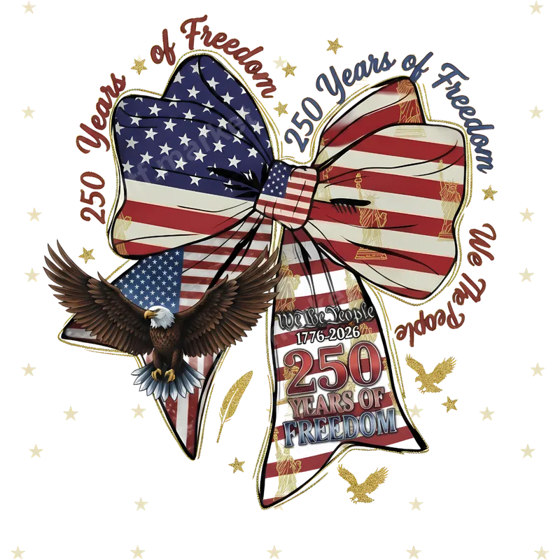 See allCelebrate two and a half centuries of American liberty with this stunning '250 Years of Freedom' DTF transfer. This vibrant design features a majestic bald eagle soaring proudly over an American flag bow, commemorating the monumental 1776-2026 milestone. Intricate "We The People," subtle Lady Liberty and Liberty Bell silhouettes, and gold glitter accents add patriotic depth. This high-quality DTF transfer is ready to press, perfect for personalizing apparel. Ideal for patriots, history enthusiasts, and anyone proud of American heritage, this heat transfer is perfect for national celebrations. Adorn your wardrobe for the 4th of July, Memorial Day, Veterans Day, or other patriotic events. It makes an excellent gift for veterans, active military, history teachers, or family who cherish freedom. Show your unwavering pride and commemorate this special anniversary. Applying this iron on transfer is simple and efficient. Designed for professional results, it works seamlessly on a wide range of fabrics including cotton, polyester, and blends. Achieve a perfect application using a heat press set between 300-325°F for 15 seconds with medium pressure, or use a standard household iron. Enjoy the convenience of a ready-to-use apparel transfer that requires no weeding, saving time and effort. Experience superior quality with our durable direct to film transfer. Each design boasts incredibly vibrant colors and sharp details that resist cracking and peeling, ensuring your patriotic apparel looks great wash after wash. The professional-grade DTF film provides a soft, flexible feel that seamlessly integrates with your garment, creating a finished product that looks and feels professionally printed. Elevate your custom creations with a transfer built to last.