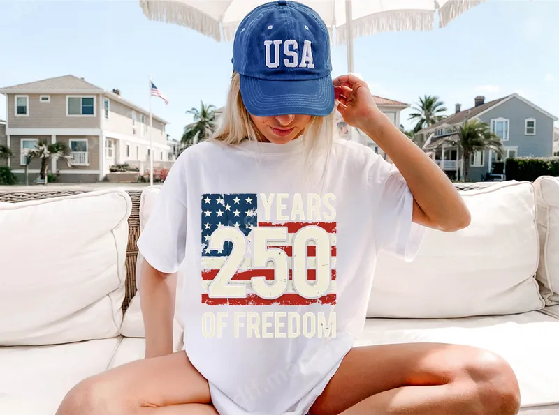 See allShow your unwavering American pride with this stunning '250 Years of Freedom' DTF transfer. This vibrant, ready to press design features a distressed patriotic flag background, proudly displaying the milestone '250' with the inspiring text 'Years of Freedom.' The vintage aesthetic gives it a classic, timeless appeal, perfect for celebrating our nation's history and enduring spirit. This high-quality direct to film transfer adds a meaningful touch to any garment or accessory. This patriotic DTF heat transfer is perfect for anyone looking to commemorate America's upcoming 250th anniversary. It’s an excellent choice for Independence Day (4th of July), Memorial Day, Veterans Day, Flag Day, or any occasion to express national pride. Ideal for veterans, military families, history enthusiasts, or anyone who loves their country. Create custom apparel for family gatherings, community events, parades, or as thoughtful gifts for fellow patriots. Applying this professional heat press design is incredibly simple, suitable for both experienced crafters and beginners. Our iron on transfers work beautifully on a wide variety of fabrics, including cotton, polyester, and cotton/poly blends. For best results, use a heat press at 300-325°F for 15 seconds with medium pressure. It can also be applied with a household iron, following included instructions. Best of all, no weeding required – just press and peel! Crafted using premium DTF film and inks, this apparel transfer promises exceptional durability and a vibrant, long-lasting finish. The colors are rich and true, designed to withstand numerous washes without cracking, peeling, or fading. You'll love the soft, smooth feel of the design on your fabric, unlike bulky vinyl. Experience professional-grade results every time with our high-quality, strong adhesive DTF transfers, ensuring your patriotic statement endures.