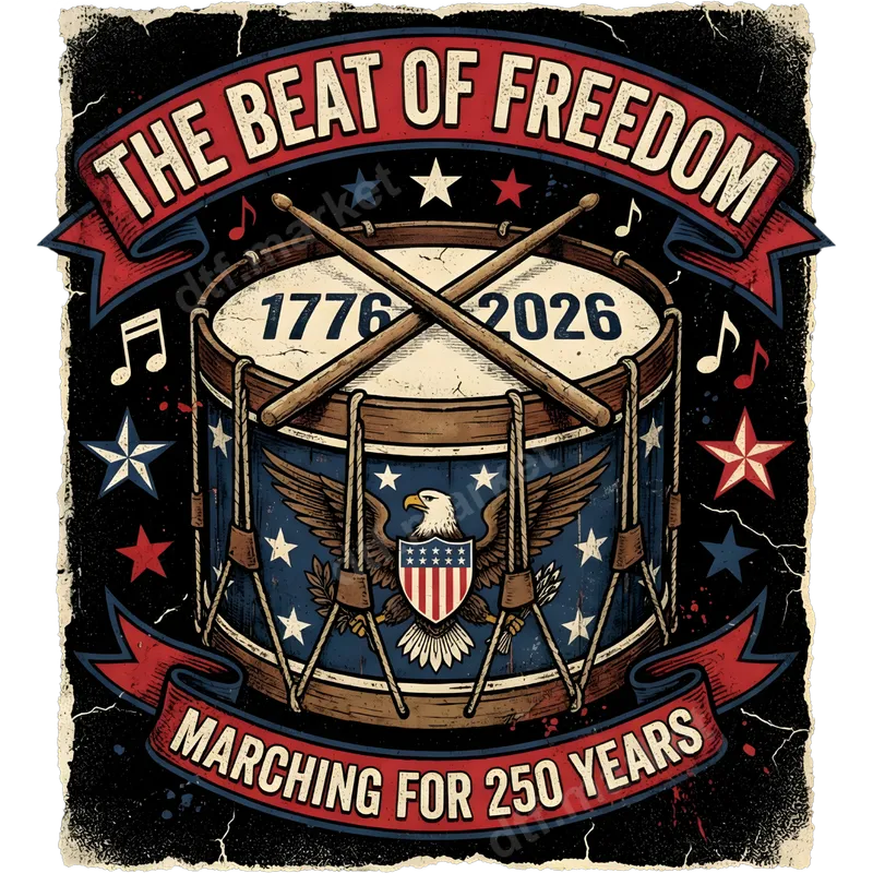 See allThis eye-catching DTF transfer celebrates "The Beat of Freedom," commemorating 250 years of American independence from 1776 to 2026. The design features a vintage-style marching drum emblazoned with a majestic bald eagle shield and stars, complete with crossed drumsticks and musical notes. This ready to press transfer captures a powerful, patriotic spirit, ideal for anyone looking to honor the nation's historic milestone with a classic, distressed aesthetic. Perfect for patriots, veterans, military families, and history enthusiasts, this versatile design is suitable for a wide range of patriotic events. Imagine it on apparel for Fourth of July celebrations, Memorial Day gatherings, Veterans Day, or any occasion that calls for a proud display of American heritage. It also makes a thoughtful gift for those who cherish freedom and national pride. Applying this high-quality heat press design is simple and efficient. Our DTF transfers are compatible with various fabric types, including cotton, polyester, and cotton-poly blends, ensuring maximum versatility. For best results, use a heat press at 300-325°F for 15 seconds with medium pressure, then cold peel. A household iron can also be used, though results may vary. Enjoy the convenience of a no-weeding iron on transfer process. Crafted using professional-grade DTF film, this t-shirt transfer ensures vibrant colors, exceptional durability, and a soft, flexible feel that seamlessly integrates with your chosen garment. The strong adhesive provides superior washability and crack-resistant longevity, meaning your patriotic statement will endure wear after wear. Experience premium quality with every apparel transfer from dtf.market.