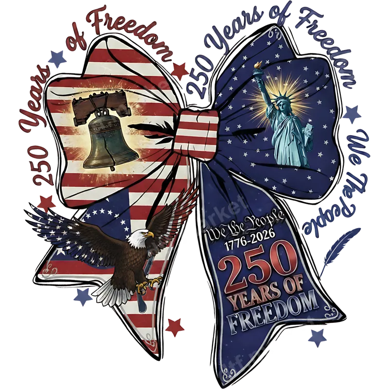 See allThis vibrant DTF transfer proudly commemorates "250 Years of Freedom" (1776-2026), perfect for upcoming celebrations. The central motif is a detailed bow: one side showcases the Liberty Bell against an American flag backdrop, the other features the majestic Statue of Liberty amidst stars. A powerful bald eagle in flight adds to the spirit of liberty, making this truly ready to press statement piece. This unique heat transfer is ideal for anyone expressing American pride, especially for the nation's 250th independence anniversary. It's perfect for Fourth of July, historical commemorations, Memorial Day, Veterans Day, or any patriotic gathering. An excellent gift for history teachers, veterans, active service members, or anyone cherishing American heritage. Customize apparel for events or everyday wear. Applying this ready to press transfer is simple and efficient. Our high-quality direct to film transfers adhere beautifully to cotton, polyester, and blends. For best results, use a heat press at 300-325°F for 15 seconds with medium pressure, then cold peel. While a heat press is recommended, this versatile iron on transfer can also be applied with a household iron. Enjoy no weeding or masking, saving valuable time. Crafted with professional-grade DTF film, this heat press design ensures exceptional durability and vivid color reproduction. The print is crack-resistant, ensuring your garments maintain their stunning appearance wash after wash. The finished design boasts a soft, flexible feel on the fabric, providing comfort without stiffness. Our apparel transfers are made with strong adhesive, guaranteeing a long-lasting bond. Experience premium quality with every heat press ready application.
