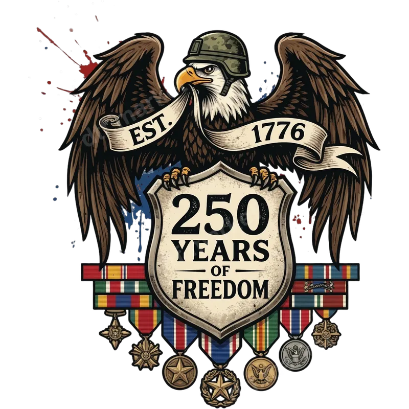 See allThis powerful DTF transfer features a majestic bald eagle, adorned with a military helmet, symbolizing strength and vigilance. It proudly holds a shield proclaiming "250 YEARS OF FREEDOM" and a banner marking "EST. 1776," commemorating a significant milestone in American history. Detailed military medals and ribbons signify honor and service, set against vibrant red and blue splatters. This design is a stunning tribute to the USA, arriving ready to press onto your chosen garment. This iconic heat transfer design is ideal for veterans, active military personnel, patriotic Americans, and history enthusiasts. It’s perfect for celebrating national holidays like the 4th of July, Memorial Day, and Veterans Day, or for commemorating the upcoming 250th anniversary of American independence. Use this unique shirt design to create meaningful gifts for family and friends, or to showcase your pride at patriotic events. Our ready to press transfers are incredibly versatile, adhering beautifully to a wide range of fabrics including cotton, polyester, and various blends. For professional results, apply with a heat press at 300-325°F for 15 seconds with medium pressure. For home crafters, a household iron can also be used following careful instructions. Enjoy the convenience of a no-weeding design – simply press and peel for a flawless custom transfer. Experience premium quality with our direct to film transfers. Each design boasts vibrant colors, exceptional detail, and a soft, flexible feel that resists cracking and peeling, ensuring longevity for your apparel. Printed on professional-grade DTF film with a strong, durable adhesive, these heat press designs are built to last. Create apparel that stands out and proudly displays your patriotism with a transfer that looks professionally printed and feels great.