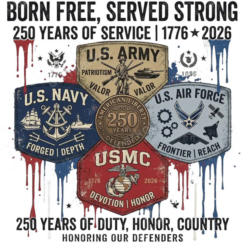 See allThis exceptional DTF transfer celebrates 250 years of American military service (1776-2026). Featuring a bold, distressed vintage design, it proudly showcases the U.S. Army, Navy, Air Force, and USMC with iconic emblems and core values like Patriotism, Valor, Devotion, and Honor. A central "American Liberty 250 Years Defended" medallion is surrounded by patriotic red, white, and blue paint drips, creating a powerful, ready to press statement piece. This patriotic design is ideal for active service members, veterans, military families, and anyone honoring our nation's defenders. Perfect for Memorial Day, Veterans Day, Independence Day (4th of July), military appreciation events, or as a meaningful gift. Use this heat transfer to create custom apparel that pays tribute to the enduring legacy of sacrifice and duty, proudly displaying your support for American liberty. Our premium direct to film transfer is designed for easy application on cotton, polyester, and various blends. Applying your new design is simple with a heat press: set to 300-325°F for 15 seconds with medium pressure. Unlike traditional vinyl transfers, there's no weeding required. For best results, a household iron can also be used with careful, even pressure, making it an accessible iron on decal for all. Experience superior quality with our vibrant, crack-resistant heat press designs. Each t-shirt transfer is printed using professional-grade DTF film and inks, ensuring incredible color fidelity and a soft-to-touch finish that feels like part of the fabric. The strong adhesive guarantees long-lasting durability, even after numerous washes. Elevate your apparel with a professional-grade shirt design that stands the test of time.