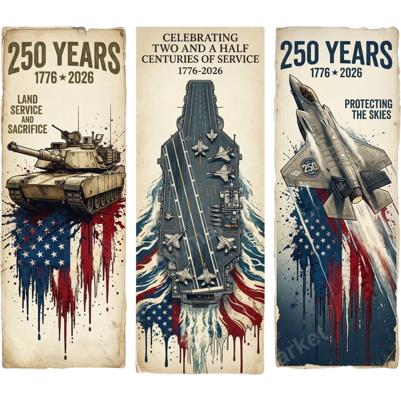 See allHonor two and a half centuries of unwavering dedication with our exclusive 250 Years US Military Service DTF transfer set. This collection features three distinct designs, each celebrating a vital branch of the American armed forces: a powerful tank representing land service, a mighty aircraft carrier symbolizing naval strength, and a sleek fighter jet protecting the skies. Each image is rendered with a dynamic, distressed American flag motif, creating a bold and meaningful visual statement that is a ready to press DTF transfer. This patriotic heat transfer set is perfect for veterans, active-duty personnel, military families, and anyone who wants to proudly display their American spirit and support for our servicemen and women. Ideal for commemorating significant dates like Veterans Day, Memorial Day, or the 4th of July, these transfers make exceptional gifts or personal apparel statements. Show your appreciation for the land, sea, and air services that have defended our freedoms for 250 years. Our DTF transfers are incredibly versatile and can be applied to a wide range of fabrics, including cotton, polyester, and various blends. Achieve professional results using a standard heat press at 300-325°F for 15 seconds with medium pressure, or even with a household iron (though results may vary). Enjoy the convenience of no weeding or masking required – simply press and peel for a flawless iron on decal. Crafted with premium materials, these apparel transfers boast vibrant, long-lasting colors that resist cracking and peeling. The professional-grade DTF film ensures a soft hand feel and superior adhesion, providing a durable and high-quality finish on any garment. Create custom shirts, hoodies, bags, and more with ease, knowing you’re using a product designed for excellence.
