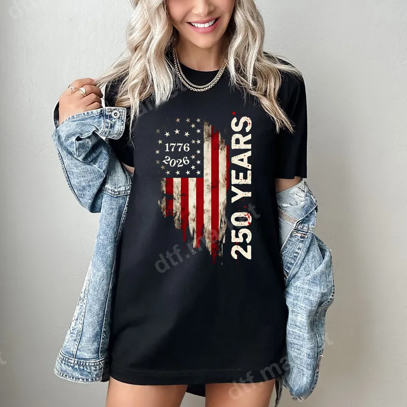 See allThis impactful DTF transfer commemorates 250 years of American history, spanning from 1776 to 2026. Featuring a rugged, distressed American flag design with the bold text "250 YEARS," this ready to press graphic captures a spirit of enduring patriotism. It's a striking heat transfer that combines vintage aesthetics with a significant national milestone, perfect for honoring the USA's Semiquincentennial. This design is ideal for history enthusiasts, patriots, veterans, and anyone proud to celebrate America's heritage. It makes a thoughtful gift for Independence Day, national holidays, or year-round display of American pride. Apply this versatile iron on transfer to personalize apparel for family events, historical commemorations, or simply everyday wear to showcase your love for the country. Our premium direct to film transfers are incredibly easy to apply, working seamlessly with a heat press at 300-325°F for 15 seconds with medium pressure. For best results, a household iron can also be used with care. There's no weeding required, making the application process quick and efficient. Simply press, peel (warm or cool peel depending on design), and enjoy your professional-looking custom transfer. Experience vibrant, full-color designs that are built to last. Our DTF transfers are crafted from high-quality film, ensuring they are crack-resistant, fade-resistant, and incredibly soft to the touch. The strong adhesive guarantees excellent durability, allowing your design to withstand countless washes while maintaining its professional finish. Transform any garment into a patriotic statement with superior quality.