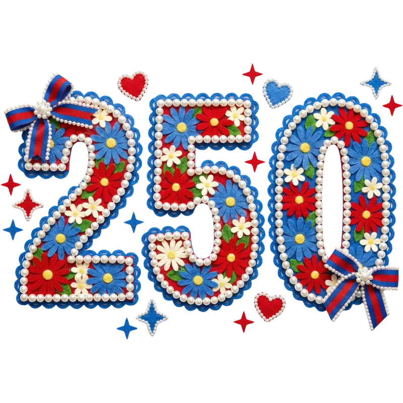 See allThis DTF transfer features the number "250" adorned with intricate red, white, and blue felt flowers, delicate pearl borders, and patriotic ribbon bows. It's a vibrant, ready to press design perfect for commemorating significant milestones. Small red hearts and blue stars scattered around enhance its festive and celebratory appeal on any garment or accessory. This versatile heat press transfer is ideal for celebrating 250th anniversaries, milestone birthdays, or historical commemorations. Perfect for custom apparel for special events, family reunions, or community gatherings with a patriotic theme. It makes a thoughtful and unique iron on transfer for crafters, small businesses, or anyone personalizing gifts like t-shirts, tote bags, or flags. Applying this heat press design is straightforward and hassle-free, working beautifully on a wide variety of fabric types, including cotton, polyester, and blends. For best results, use a heat press at 300-325°F for 15 seconds with medium pressure. A household iron can also be used, making it accessible. Unlike vinyl transfers, there's no weeding required, saving you time. Our premium DTF transfers boast exceptional quality, ensuring vibrant colors that truly pop and maintain integrity wash after wash. The design is crack-resistant, providing long-lasting durability, and offers a soft, smooth feel on the garment. Each shirt design is printed on professional-grade DTF film with strong adhesive, guaranteeing a perfect application and a durable finish for your apparel.