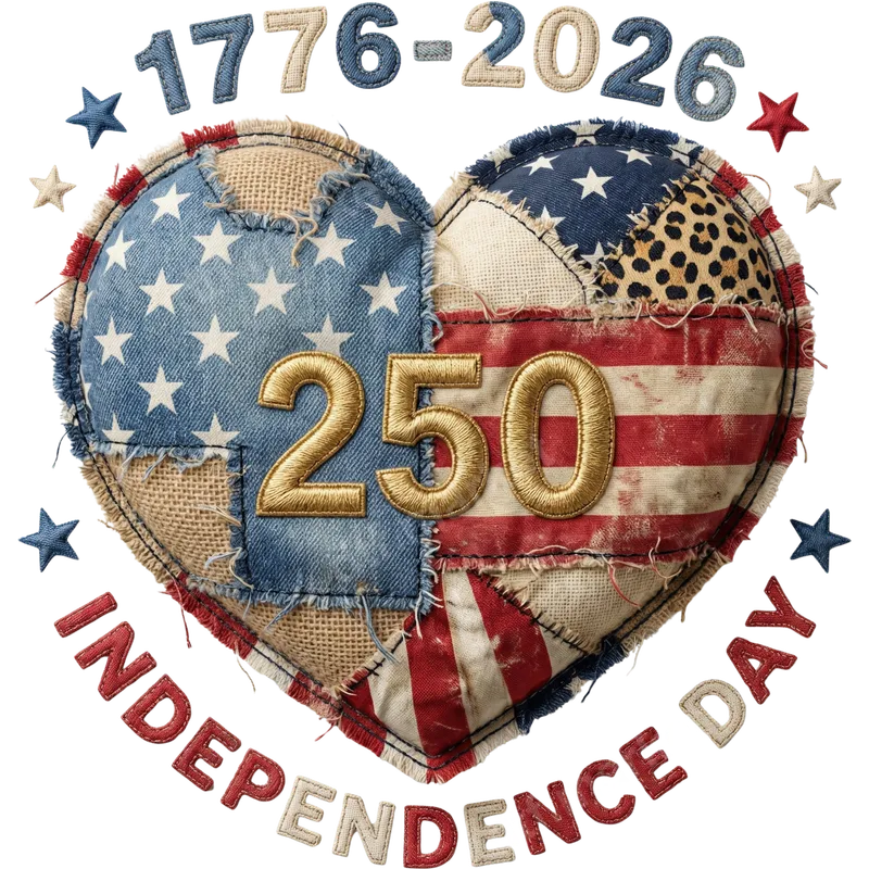 See allThis vibrant DTF transfer features a unique distressed fabric patchwork heart design, celebrating America's 250th Independence Day. The heart is crafted from rustic denim stars, burlap, and vintage flag stripes, with a subtle leopard print accent for a modern touch. Bold gold "250" numbers are embroidered at the center, flanked by "1776-2026" above and "INDEPENDENCE DAY" below, surrounded by charming fabric stars. This ready to press transfer captures a heartfelt, handcrafted patriotic aesthetic, perfect for honoring a significant milestone in American history. This commemorative design is ideal for patriots, history enthusiasts, and anyone celebrating the 250th anniversary of American independence. It’s perfect for July 4th celebrations, Memorial Day, Veterans Day, or everyday display of national pride. Create custom apparel for family reunions, historical events, or as a meaningful gift for veterans, military families, or history teachers. This unique heat press design makes a strong statement of enduring American spirit. Applying this direct to film transfer is straightforward and hassle-free. It works beautifully on a wide range of fabrics, including cotton, polyester, and various blends, ensuring versatility for your projects. For best results, use a heat press at 300-325°F for 15 seconds with medium pressure, followed by a cool peel. While a heat press is recommended for professional application, this durable iron on transfer can also be applied with a household iron, making customization accessible for everyone. Enjoy professional-quality results without the need for weeding. Our premium DTF transfers are known for their exceptional quality and vibrant colors that pop off any garment. Printed on professional-grade DTF film, each design is meticulously crafted to be crack-resistant, peel-resistant, and incredibly soft to the touch, ensuring maximum comfort and longevity. The strong adhesive ensures your design stays put, wash after wash. Experience the durability and rich detail of a high-quality apparel transfer, making your custom creations stand out.