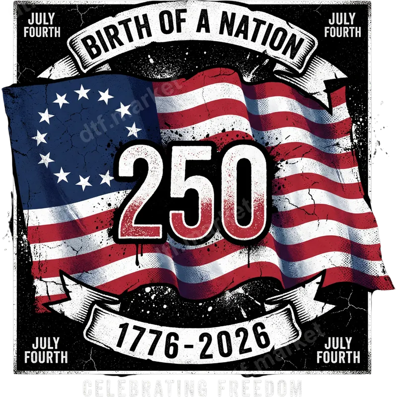 See allThis striking DTF transfer features a powerful, distressed rendition of the iconic Betsy Ross American flag, celebrating 250 years of the United States. Bold "250" numbers are prominently displayed over the vintage-style flag, accompanied by banners proclaiming "BIRTH OF A NATION" and "1776-2026". The gritty, weathered aesthetic evokes a strong sense of history and resilience. This heat press ready design is perfect for creating unique apparel that commemorates a significant national milestone. This patriotic iron on transfer is ideal for anyone looking to celebrate America's 250th anniversary, especially for July 4th festivities in 2026. It’s perfect for history enthusiasts, veterans, or anyone who loves American heritage. Create custom shirts for commemorative events, patriotic parades, or as a meaningful gift for friends and loved ones. Applying this versatile heat transfer is incredibly easy on various fabric types like cotton, polyester, and blends. Use a professional heat press at 300-325°F for 15 seconds with medium pressure, or even a household iron for simple application. This ready to press transfer requires no weeding or layering, simplifying your customization process. Experience superior quality with this professional-grade direct to film transfer. The vibrant colors pop and resist cracking or fading, ensuring your custom apparel looks great wash after wash. Manufactured using premium DTF film and strong adhesive, this apparel transfer offers a soft-to-touch feel that integrates smoothly into the fabric, providing durability and comfort.