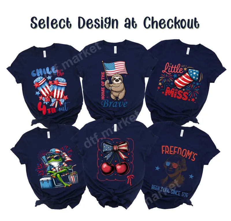 See allGet ready to celebrate Independence Day in style with our festive 4th of July DTF transfer collection! This diverse range features playful and patriotic designs perfect for showing off your American spirit. Choose from charming graphics like a cool frog rocking flag shades, a laid-back sloth proudly holding the American flag, vintage-inspired cherries with a patriotic bow, or witty quotes paired with iconic imagery like George Washington in sunglasses. Each ready to press design brings vibrant colors and unique flair to any garment, making your apparel stand out at any summer gathering. These versatile heat press designs are ideal for anyone looking to personalize their wardrobe for national holidays, family barbecues, fireworks displays, or simply to express their patriotism. Perfect for crafters, small business owners, or individuals making custom gifts, these transfers offer an easy way to create unique apparel for adults and kids alike. They make fantastic additions to summer outfits, commemorative event wear, or as thoughtful presents for friends and family during Memorial Day, Independence Day, or any patriotic occasion. Our premium DTF transfers are incredibly simple to apply using either a professional heat press or a household iron. They adhere beautifully to a wide variety of fabrics, including cotton, polyester, and their blends, ensuring maximum versatility for your projects. For best results with a heat press, apply at 300-325°F for 15 seconds with medium pressure. Unlike traditional vinyl, these iron on transfers require absolutely no weeding, saving you time and effort while delivering crisp, clean results every time. Follow detailed instructions included with your order for flawless application. Experience superior quality with our professionally printed apparel transfers. Each design boasts vibrant, true-to-color inks that are remarkably crack-resistant and durable, ensuring your custom creations last wash after wash. The soft-touch finish integrates seamlessly with the fabric, providing a comfortable feel that won't peel or fade. Utilizing high-quality DTF film with a strong adhesive, these t-shirt transfers guarantee a professional-grade finish that looks store-bought, making every project a success.