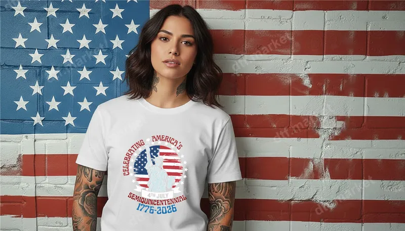 See allThis vibrant DTF transfer proudly showcases a patriotic design commemorating America's Semiquincentennial. Featuring the iconic Statue of Liberty silhouetted against a distressed American flag backdrop, the design is encircled by stars and bold text announcing 'CELEBRATING AMERICA'S 4TH JULY SEMIQUINCENTENNIAL 1776-2026'. This ready to press design perfectly captures the spirit of independence and national pride, making it an ideal choice for upcoming celebrations. Perfect for patriots, history enthusiasts, and anyone looking to express their American pride, this heat press ready design is ideal for the 250th anniversary in 2026. Wear it proudly at 4th of July parades, Memorial Day gatherings, Veterans Day events, or any occasion where national spirit shines. It also makes a fantastic gift for friends and family who cherish American heritage and history. Applying this direct to film transfer is effortless. It adheres beautifully to a wide range of materials, including cotton, polyester, and various blends. For best results, use a heat press at 300-325°F for 15 seconds with medium pressure. Even if you don't have a heat press, a household iron can be used following similar instructions. Enjoy the convenience of an iron on transfer that requires absolutely no weeding, saving you time and effort. Our premium DTF transfers are known for their exceptional quality. Experience vibrant colors that pop, superior durability that resists cracking and peeling, and a soft-to-touch finish that feels great on any garment. Each apparel transfer is crafted using professional-grade DTF film and strong adhesive, ensuring your custom creation lasts wash after wash. Transform your wardrobe with a durable and stunning shirt design that truly stands out.