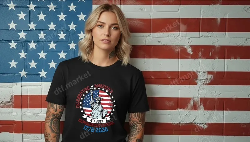 See allThis striking DTF transfer proudly celebrates America's Semiquincentennial, marking 250 years of independence from 1776 to 2026. The design features a majestic Statue of Liberty, standing tall against a vibrant, circular American flag background, encircled by the celebratory text "CELEBRATING AMERICA'S SEMIQUINCENTENNIAL." This ready to press design encapsulates patriotic pride and historical significance, perfect for commemorating this momentous national anniversary. Ideal for proud patriots, history enthusiasts, and anyone looking to express their American spirit, this versatile design is perfect for the 4th of July, Memorial Day, Veteran's Day, or any patriotic gathering. It makes an excellent gift for family and friends who appreciate American heritage or are simply gearing up for the next Independence Day celebration. Showcase your love for the USA with this iconic heat transfer. Our premium quality DTF transfer is designed for effortless application on a wide variety of fabrics, including cotton, polyester, and their blends. Achieve a professional finish using a standard heat press at 300-325°F for 15 seconds with medium pressure. For hobbyists, this iron on transfer can also be applied with a household iron, following included instructions. Best of all, there's no tedious weeding required – just press and wear! Experience superior quality with every apparel transfer from dtf.market. Our DTF transfers boast vibrant, true-to-color prints that are exceptionally durable, crack-resistant, and incredibly soft to the touch. Made with professional-grade DTF film and strong adhesive, these designs are built to last, maintaining their pristine look wash after wash. Elevate your apparel with a transfer that truly stands out.