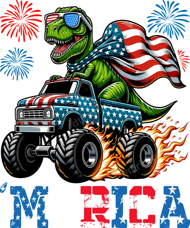 See allCelebrate Independence Day with roaring American pride using this fantastic 'Merica T-Rex Monster Truck DTF transfer. This eye-catching design features a cool T-Rex sporting American flag sunglasses and a flowing flag cape, confidently driving a patriotic, star-spangled monster truck with flames kicking up from the wheels. Festive fireworks burst in the background, and the distressed 'M RICA text below completes this lively, ready to press image perfect for any festive occasion. This vibrant heat transfer is ideal for anyone looking to showcase their American spirit with a touch of humor and style. Perfect for 4th of July celebrations, Memorial Day gatherings, Labor Day barbecues, or any patriotic event, it makes a fantastic gift for dads, grandpas, kids, monster truck fans, and dinosaur enthusiasts. Easily create custom apparel for family events or personal wear that will surely stand out from the crowd. Applying this iron on transfer is straightforward and hassle-free. It works beautifully on a wide variety of fabrics, including cotton, polyester, and their blends. For best results, use a heat press at 300-325°F for 15 seconds with medium pressure, then perform a cool peel. This amazing ready to press transfer eliminates the need for weeding, saving you time and effort to create professional-looking garments in minutes. If a heat press is not available, detailed instructions for household iron application are also provided. Our premium DTF transfers are known for their exceptional quality and durability. You'll love the vibrant colors and crisp details that bring this patriotic T-Rex monster truck to life. The transfers are crack-resistant, peel-resistant, and provide a soft, smooth feel on any garment. Crafted with professional-grade DTF film and strong adhesive, this apparel transfer ensures your custom creations will withstand countless washes and wear, looking fantastic for years to come.