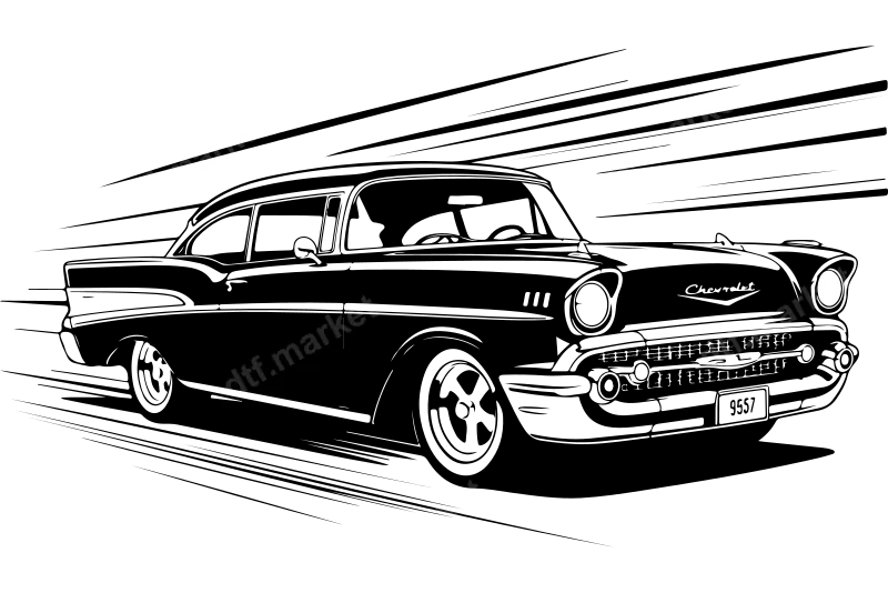 See allDive into the golden era of American automobiles with this striking '57 Chevy Bel Air DTF transfer. This black and white illustration captures the iconic profile of the classic 1957 Chevrolet Bel Air, complete with dynamic speed lines that evoke a sense of motion and timeless cool. It's a premium direct to film transfer, meticulously designed and ready to press onto your favorite apparel. This vintage hot rod heat transfer is perfect for car enthusiasts, classic automobile collectors, and anyone who appreciates retro Americana styling. Whether you're attending a car show, cruising down memory lane, or just want to showcase your passion for legendary vehicles, this design is an excellent choice. It also makes an unforgettable gift for fathers, grandfathers, or any vintage car lover for birthdays, Father's Day, or special occasions. Applying this ready to press transfer is incredibly easy, making it ideal for both seasoned crafters and beginners. Our high-quality iron on transfer works flawlessly on a wide range of fabrics, including cotton, polyester, and various blends. For best results, use a heat press at 300-325°F for 15 seconds with medium pressure, then cool peel. While a heat press is recommended, careful application with a household iron is also possible. No tedious weeding or layering required, just press and wear! Experience professional-grade results with our durable and vibrant apparel transfer. The intricate details of this classic car design will stand out, offering excellent washability and resistance to cracking or fading. This t-shirt transfer features a soft-touch finish and strong adhesive, ensuring your custom garments look fantastic for years to come. Elevate your wardrobe with a piece of automotive history.