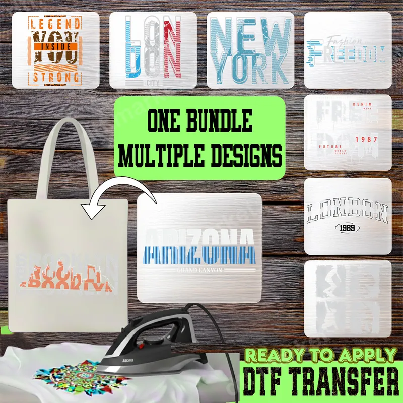 See allThis 8-pack bundle features distressed city names, retro typography, and inspirational phrases, capturing an urban streetwear and vintage aesthetic. Designs include iconic locations like London, New York, Brooklyn, and Arizona, alongside themes like "Legend Strong" and "Fashion Freedom." Each offers a textured, worn-in look popular in modern fashion. These high-quality DTF transfers are ready to press, allowing you to instantly customize garments and accessories with professional results. This versatile ready to press transfer bundle is perfect for fashion-forward individuals, streetwear enthusiasts, and DIY apparel decorators. Ideal for creating custom merchandise, personalized gifts for friends who love urban culture, or simply upgrading your wardrobe. They're great for everyday wear, casual events, or unique gifts for birthdays and holidays for anyone who appreciates a cool, retro-inspired aesthetic. Applying these heat transfers is straightforward. Our premium iron on decals are compatible with cotton, polyester, and most fabric blends. For best results, use a heat press at 300-325°F for 15 seconds with medium, even pressure. While a heat press is recommended, these apparel transfers can also be applied with a household iron. No weeding or layering is required, saving you time and effort. Experience the superior quality of dtf.market's ready to press DTF transfers. Each design is printed with vibrant, long-lasting colors that resist cracking, peeling, and fading. The professional-grade DTF film ensures a soft, flexible feel on the fabric, providing comfort without compromising durability. With strong adhesive, these t-shirt transfers bond securely, guaranteeing a high-quality, professional finish that will impress.