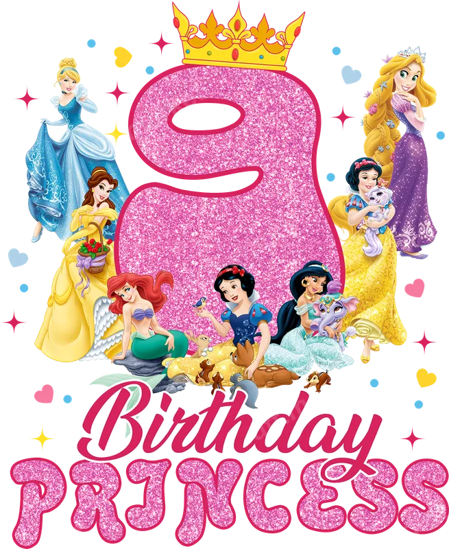 9th Birthday Princess DTF Transfer | Glitter Number 9 & Fairy Tale Friends