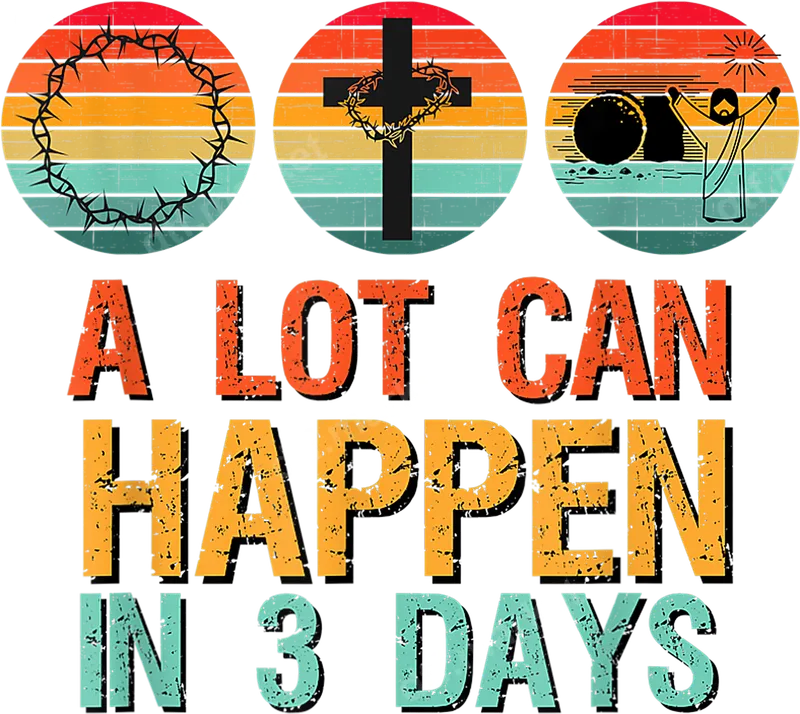 See allThis "A Lot Can Happen In 3 Days" DTF transfer powerfully conveys the Christian Easter story. It features distressed retro-style circles depicting the crown of thorns, the cross, and the empty tomb with a risen Jesus. The vibrant, distressed text beautifully complements these profound symbols, making this heat press ready apparel transfer a striking statement of faith. It merges vintage aesthetics with deep spiritual meaning for a truly impactful design. This inspirational iron on is perfect for expressing Christian faith, especially during Easter. Ideal for church groups, youth events, family gatherings, or as a thoughtful gift for believers. Wear it to Sunday service, spiritual retreats, or simply to proudly display your convictions. This design deeply resonates with the core message of hope and new life, allowing you to create custom t-shirts or unique gifts for your community. Applying this ready to press transfer is incredibly simple. It adheres perfectly to cotton, polyester, and blends. For optimal results, use a heat press at 300-325°F for 15 seconds with medium pressure. A household iron is also suitable with care. The "no weeding" feature means you just press and peel, making customization quick and effortless for both seasoned crafters and beginners. Crafted from professional-grade DTF film, this high-quality shirt design ensures brilliant, lasting colors. Our direct to film transfers are celebrated for their exceptional durability, crack resistance, and a soft, lightweight feel after application. The robust adhesive guarantees a long-lasting bond to your chosen garment, enduring countless washes. Invest in premium quality that transforms everyday apparel into a powerful expression of faith.