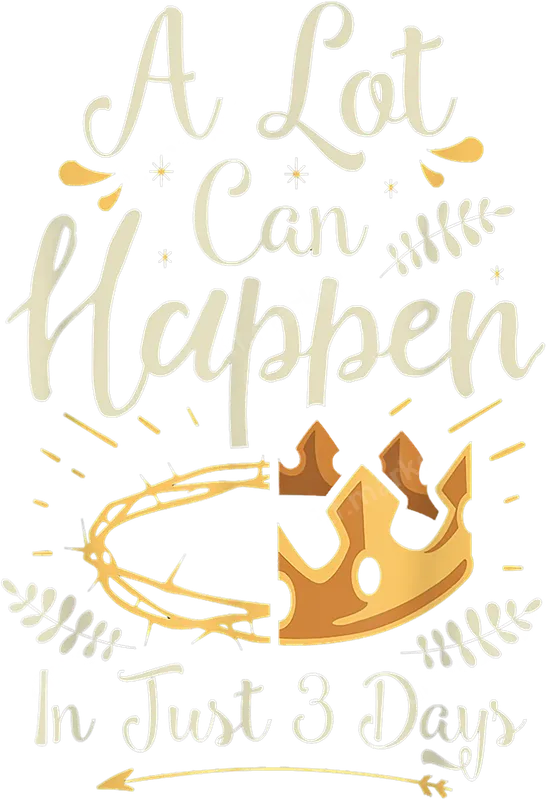 See allThis uplifting Christian DTF transfer features the powerful message "A Lot Can Happen In Just 3 Days," beautifully rendered in elegant script and sans-serif fonts. The design symbolically merges a crown of thorns with a regal golden crown, representing Christ's sacrifice and ultimate resurrection. This ready to press design encapsulates the core message of Easter and renewed faith. This inspirational direct to film transfer is ideal for individuals and groups celebrating their faith, especially during Easter, Lent, or any spiritual gathering. It’s perfect for church members, youth groups, or anyone looking to express devotion. Create meaningful gifts for loved ones or matching apparel for religious retreats and events with this versatile heat transfer design. Applying this apparel transfer is incredibly easy, making custom apparel accessible. Our high-quality DTF transfers work seamlessly on cotton, polyester, and blends. For best results, use a heat press at 300-325°F for 15 seconds with medium pressure. It can also be applied with a household iron. Unlike vinyl, there's no tedious weeding required, so your iron on transfer is truly ready to apply. Experience superior quality with our vibrant, professional-grade DTF transfers. Each transfer boasts brilliant colors, exceptional durability, and resistance to cracking or peeling after washing. The finished design has a soft, lightweight feel, ensuring maximum comfort. Crafted with strong adhesive and premium direct to film technology, your new t-shirt transfer will look fantastic and last.
