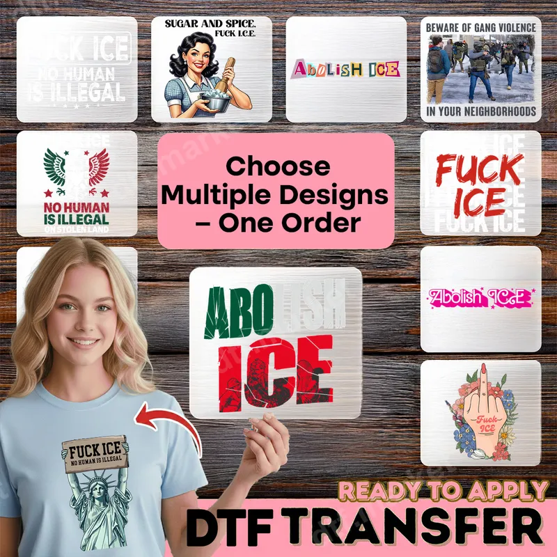 See allExpress your stance with this bold "Abolish ICE" and "No Human Is Illegal" DTF transfer. Featuring a range of impactful graphics, from a defiant Statue of Liberty to a retro-inspired pin-up girl, each direct to film transfer is designed to make a strong political statement. This ready to press design encapsulates the spirit of activism and human rights advocacy. This collection of designs is perfect for political activists, human rights advocates, and anyone passionate about immigration reform. Ideal for wearing to rallies, protests, community events, or simply as everyday attire to spark conversations. These iron on transfers also make a thoughtful and meaningful gift for like-minded friends, family, or fellow organizers. Our high-quality heat press design works seamlessly on a wide variety of fabrics, including cotton, polyester, and their blends. For best results, apply with a heat press at 300-325°F for 15 seconds with medium pressure, then cold peel. A household iron can also be used with firm, even pressure. Enjoy the convenience of a ready to press transfer with absolutely no weeding required. Each t-shirt transfer is crafted for durability and vibrant appeal. The designs are crack-resistant, ensuring they stand up to repeated washes, and feel incredibly soft to the touch once applied. Printed on professional-grade DTF film with a strong adhesive, these transfers provide a long-lasting, professional finish for all your apparel customization needs.