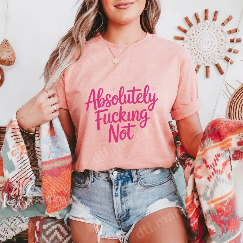 See allThis vibrant DTF transfer features the bold phrase "Absolutely F***ing Not" in a playful, script font, accented with small, sparkling starbursts. The design embodies a confident, sassy attitude, perfect for those who aren't afraid to express their boundaries with a touch of humor. This high-quality ready to press transfer makes it simple to create personalized apparel and accessories quickly. Ideal for anyone with a sarcastic wit or a strong personality, this adult humor heat press design is perfect for casual wear, social gatherings, or making a statement. It's an excellent gift for friends who appreciate a good laugh, or for yourself when you need a clear way to decline. Create custom t-shirts for bachelorette parties, girls' nights out, or everyday rebellion. Applying this versatile heat transfer is a breeze, whether you're using a professional heat press or a household iron. It adheres beautifully to a wide range of fabric types, including cotton, polyester, and various blends. For best results, heat press at 300-325°F for 15 seconds with medium pressure. Unlike traditional vinyl transfer decals, DTF requires no tedious weeding. Experience superior quality with our professional-grade DTF transfers. These designs boast incredibly vibrant colors, exceptional durability, and are crack-resistant, ensuring your garment looks fantastic even after multiple washes. The transfer leaves a soft, comfortable feel on the fabric, not stiff or bulky. Crafted with premium DTF film and strong adhesive, this apparel transfer promises a lasting, professional finish.