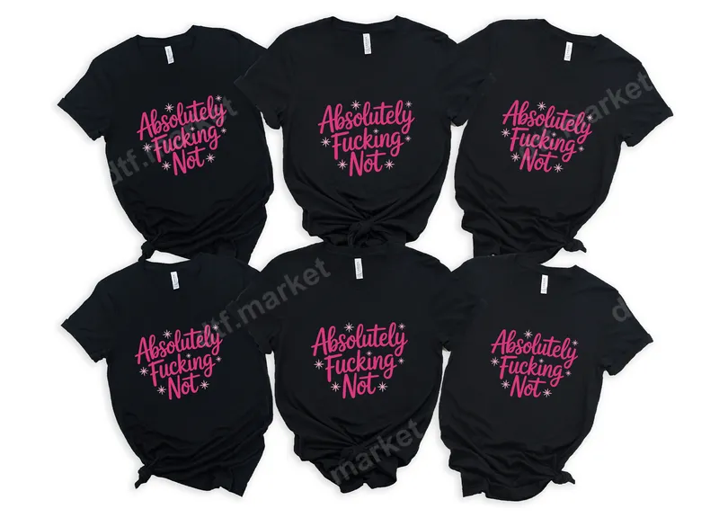 See allUnleash your inner sass with this "Absolutely Fucking Not" DTF transfer. Featuring bold, vibrant pink script adorned with playful star accents, this design instantly conveys a witty and defiant attitude. It's a premium, ready to press transfer that adds a touch of humorous rebellion to any garment, perfect for making a statement without saying a word. This cheeky heat transfer is perfect for anyone who loves sarcastic humor and isn't afraid to show it. It makes an excellent personal statement piece or a hilarious gift for friends, bachelorette parties, girls' nights out, or just everyday wear when you're feeling particularly uncooperative. Bring some blunt fun to your wardrobe or custom creations. Applying this iron on transfer is a breeze. Designed for ease, it works flawlessly on cotton, polyester, and various fabric blends. Simply use a heat press set between 300-325°F for 15 seconds with medium pressure, or apply with a household iron. Best of all, there's absolutely no weeding required, making your customization process quick and hassle-free. Our professional-grade DTF transfer boasts brilliant, crack-resistant colors that remain soft to the touch, ensuring comfort and durability. The strong adhesive film guarantees a long-lasting, vibrant shirt design that withstands washes and wear. Create professional-looking apparel with ease using this high-quality, pre-made apparel transfer.