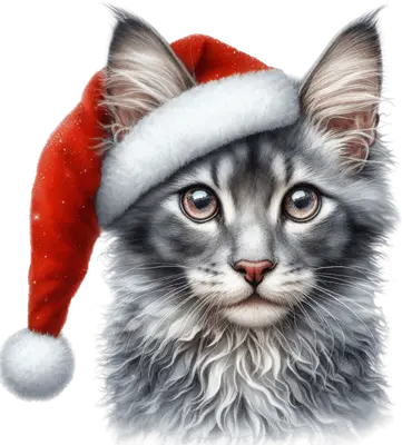 Adorable Fluffy Gray Cat Santa Hat DTF Transfer | Ready to Press