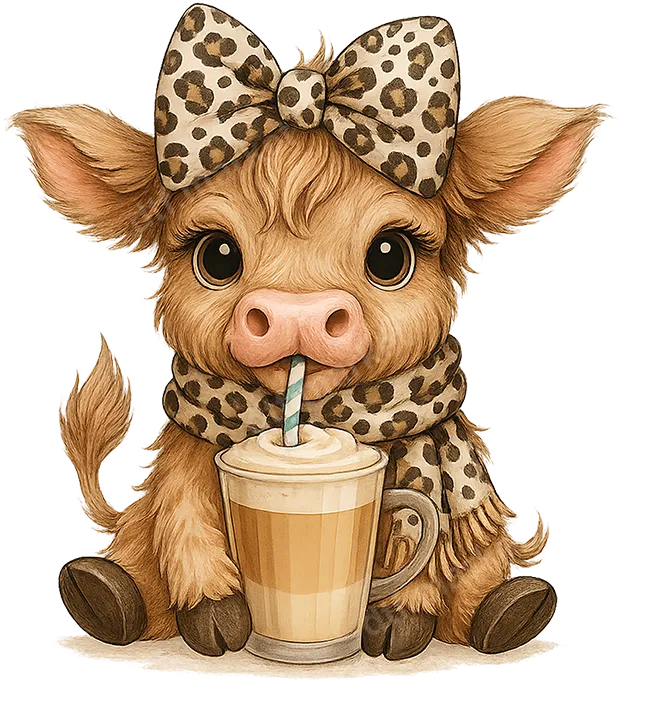 Adorable Highland Cow Calf Leopard Bow Coffee DTF Transfer
