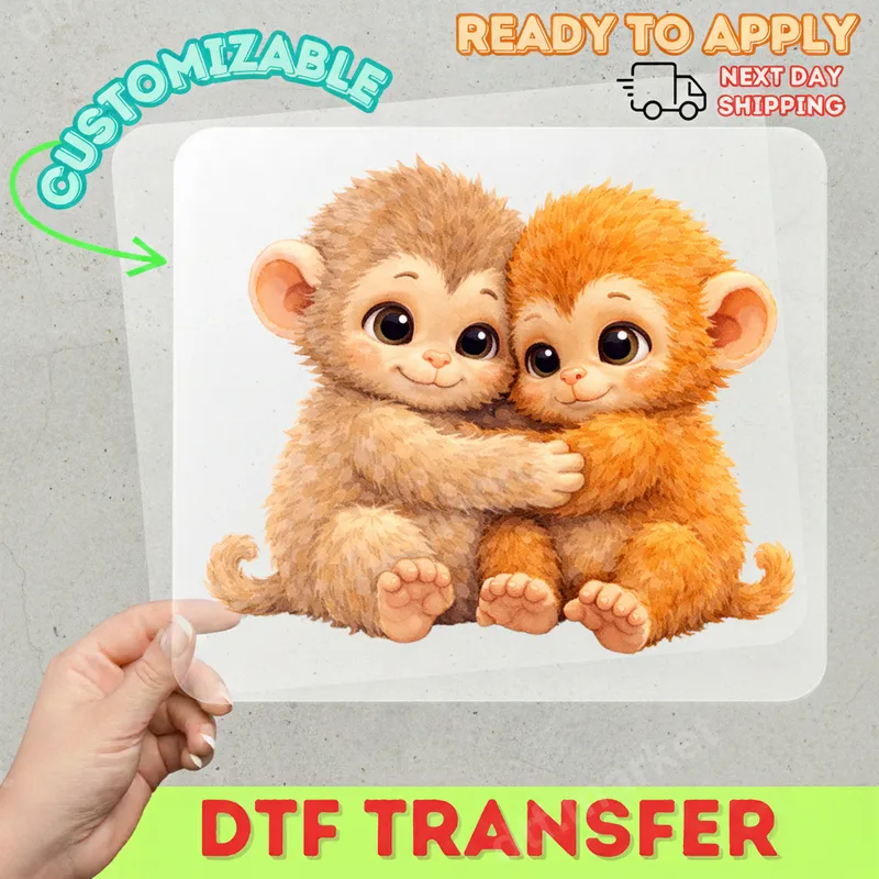 See allCapture hearts with this incredibly adorable DTF transfer featuring two sweet baby monkeys lovingly embracing each other. Their innocent eyes and fluffy textures are beautifully rendered, creating a heartwarming scene perfect for bringing a smile to anyone's face. This high-quality, ready to press design makes it easy to add a touch of charming wildlife to any garment or accessory. This charming monkey heat transfer is ideal for anyone who loves animals, especially the playful and affectionate nature of primates. It’s a wonderful choice for parents looking to personalize children's apparel, or for gift-givers preparing for baby showers, birthdays, or just because. Small businesses and DIY crafters will find this versatile design perfect for creating unique t-shirt transfers, adding a special touch to their custom projects. Applying this direct to film transfer is straightforward and efficient. Compatible with cotton, polyester, and most fabric blends, it ensures broad application possibilities. Simply use a heat press at 300-325°F for 15 seconds with medium pressure, or apply with a household iron. Forget about complex weeding or layering; our iron on transfer arrives completely prepared, making your customization process quick and hassle-free. Experience the exceptional quality of our professional DTF transfers. Each design boasts vibrant colors that pop, superior crack-resistant durability, and a remarkably soft-to-touch feel on any fabric. The strong adhesive on our heat press design ensures a long-lasting finish, maintaining its charm wash after wash. Elevate your apparel with a professional-grade decal that stands out.