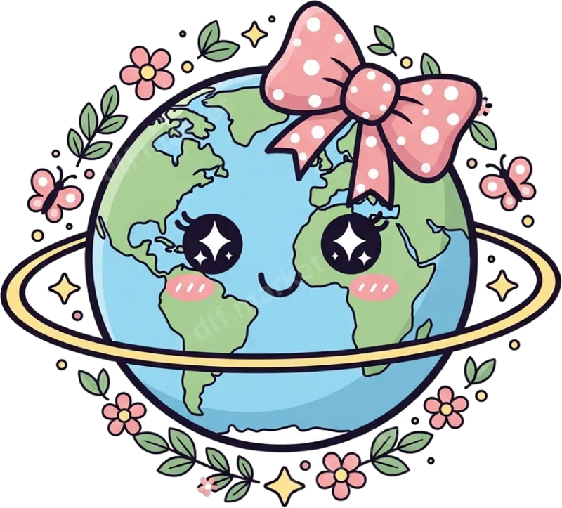 Adorable Kawaii Earth Planet with Bow DTF Transfer | Ready to Press Cute World Design