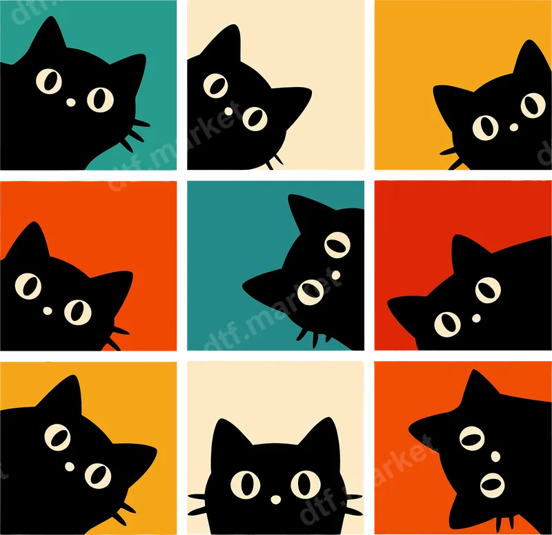 See allDiscover playful charm with our Peeking Black Cats DTF transfer. This vibrant design showcases nine adorable black cats playfully emerging from colorful, retro-inspired squares in teal, orange, yellow, red, and cream. The minimalist yet expressive style perfectly captures feline curiosity, creating an instantly heartwarming and recognizable image. It's an ideal, ready to press design for adding whimsical personality to any garment. This charming heat press transfer is perfect for cat enthusiasts, pet parents, and anyone who loves cute and quirky aesthetics. It makes an ideal gift for birthdays, Mother's Day, or simply to delight a fellow feline fanatic. Imagine custom t-shirts for casual wear, unique tote bags, or cozy hoodies. Whether for personal use or a small business creating themed apparel, this design adds joy and a dash of feline mischief. Applying this direct to film transfer is straightforward for both beginners and experienced crafters. Our durable apparel transfer works seamlessly on 100% cotton, polyester, and blends. Use a heat press at 300-325°F for 15 seconds with medium pressure, then cool peel. A household iron can also be used with firm, even pressure. Unlike traditional vinyl transfer designs, there's no tedious weeding – simply press and enjoy your professional-looking creation. Experience superior quality with our premium DTF transfers. Each image features vibrant, true-to-color pigments that pop beautifully on any fabric. These transfers offer exceptional durability, resisting cracking and peeling through numerous washes for a fresh look. Enjoy the soft, lightweight feel that integrates smoothly with the garment for comfortable wear. Our professional-grade heat press ready transfers ensure a strong, lasting finish.