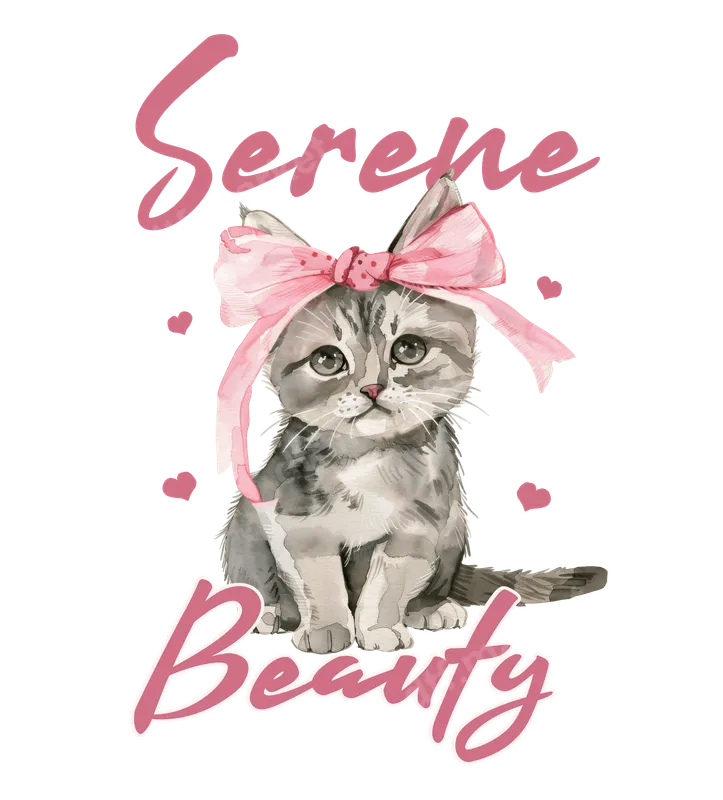 See allThis charming DTF transfer features an exquisitely rendered watercolor kitten, adorned with a sweet pink bow. Above and below the adorable feline, the elegant script text "Serene Beauty" is displayed in a matching soft pink, complemented by delicate floating hearts. This ready to press design captures a gentle and loving aesthetic, perfect for those who appreciate cute and artistic expressions. It’s an ideal way to add a touch of adorable charm to any garment or accessory. This versatile heat transfer is designed for cat enthusiasts, pet owners, and anyone who adores cute animals. It makes a delightful gift for birthdays, Mother's Day, or simply as a thoughtful gesture for a friend. Perfect for creating custom apparel for everyday wear, themed events, or even as a special touch for a child's wardrobe. Imagine this design on a cozy hoodie for a relaxed day or on a tote bag for a pet store visit. Our direct to film transfer technology ensures effortless application on a wide variety of fabrics, including cotton, polyester, and their blends. For best results, apply with a heat press at 300-325°F for 15 seconds with medium pressure, then cold peel the film. While a heat press is recommended for professional results, this iron on transfer can also be applied with a household iron (firm, even pressure) if careful instructions are followed. No tedious weeding or layering required, making customization quick and easy. Experience superior quality with our premium DTF transfers. Each heat press design boasts vibrant, true-to-life colors that resist cracking and fading, ensuring your customized items look great wash after wash. The finished transfer feels incredibly soft to the touch, seamlessly blending with the fabric without a heavy or rigid feel. Made with professional-grade DTF film and strong adhesive, you can trust in the durability and longevity of your new apparel transfer.