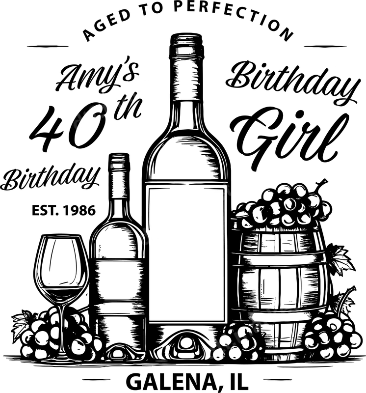 See allCelebrate a milestone birthday in style with this elegant "Aged to Perfection" DTF transfer. This sophisticated design features classic wine bottles, a delicate wine glass, and luscious grapes cascading from a rustic barrel, all framed by charming script and vintage-inspired typography. The central text proudly declares "Amy's 40th Birthday Girl EST. 1986 Galena, IL," making it a truly unique and ready to press design for a special occasion. This versatile graphic can be easily customized in spirit for any fabulous 40-year-old celebrating their special day. This premium DTF transfer is perfect for anyone celebrating a 40th birthday, especially wine enthusiasts or those who appreciate a touch of classic elegance. It makes an ideal gift for a best friend, sister, or mother, creating custom apparel for birthday parties, girls' weekend trips, or wine-tasting events. Imagine this beautiful heat press ready design on a personalized t-shirt, a custom tote bag for party favors, or a memorable sweatshirt to commemorate the big 4-0. Application is simple with our high-quality heat transfer. This iron on transfer works flawlessly on a wide variety of fabrics, including cotton, polyester, and blends. Just apply with a heat press at 300-325°F for 15 seconds with medium pressure, then peel the film after it cools completely. No messy weeding or intricate layering required, saving you time and effort to focus on the celebration. Experience exceptional quality with our professional direct to film transfer. Each design boasts vibrant colors, superior crack resistance, and a soft, smooth feel once applied. Our transfers utilize strong adhesive that ensures your design lasts wash after wash, maintaining its pristine look. Elevate your apparel projects and create stunning, personalized items with this durable and easy-to-use t-shirt transfer.